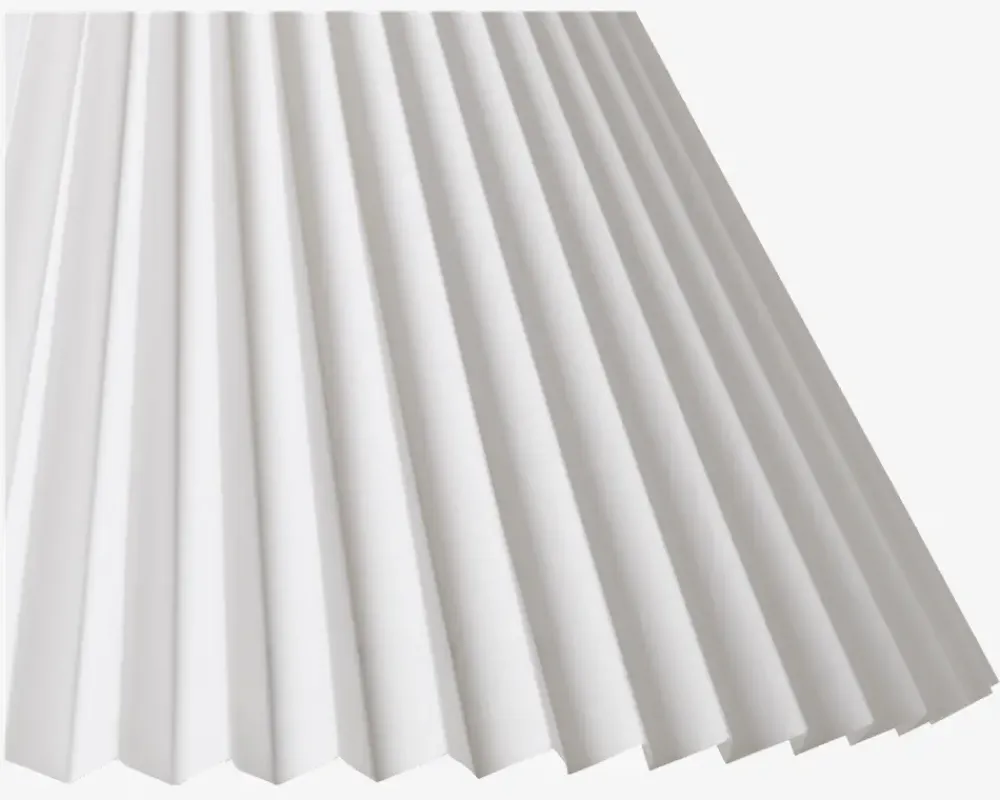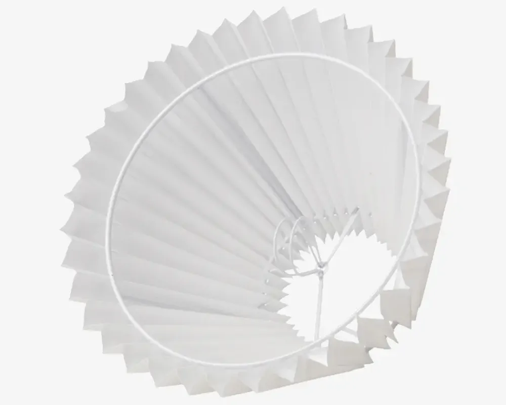 Flot og klassisk plisse lampeskærm af plastik , som passer ind i ethvert hjem, da farven er enkel og neutral. Lampeskærmen er særligt velegnet til en lampefod som kan købes fra sortiment. Lampeskærmen sættes på ved at to metalbøjler inde i lampeskærmen klikkes ned over pæren.
