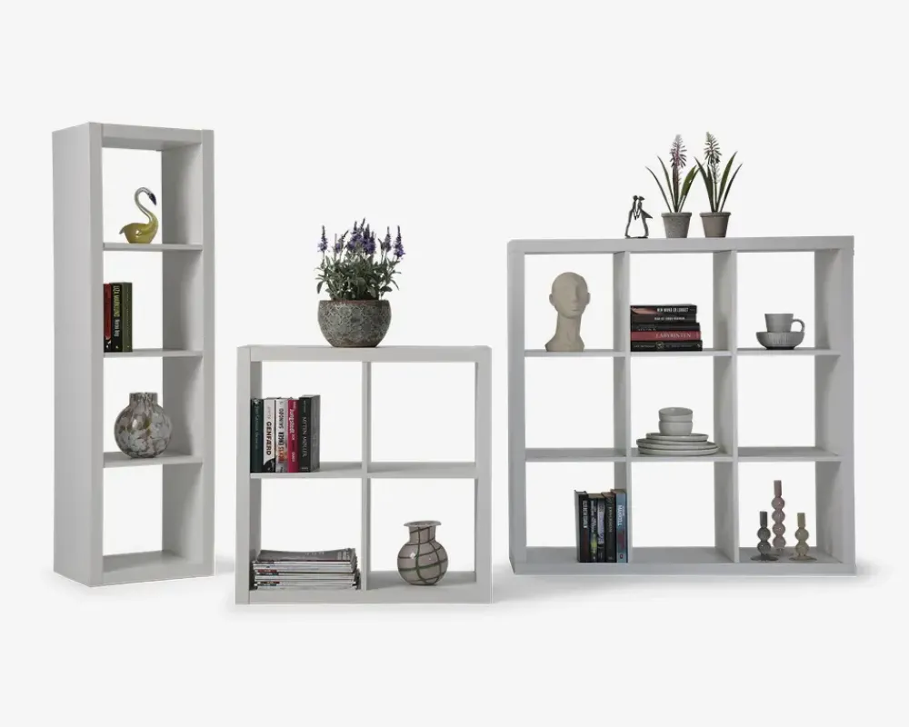 Flot rumdeler i hvid eller lys eg kunstfiner. Reolerne er produceret i tykke plader som giver et solidt og stabilt udtryk. Kunstfineren er meget rengøringsvenlig som blot tørres af med en hårdt opvredet klud med sæbevand. Reolerne kan stå frit i rummet eller langs væggen som man nu ønsker. Reolen kan fås i flere udgaver 2×2 rum, 3×3 rum og 1×4 rums reoler. Reolerne leveres usamlet, men samles nemt.Her vist som 2×2 rums reol i hvid• Enkelt design• Solidt og stabilt udtryk• Meget rengøringsvenlig• Kan stå frit eller langs væggen. • Leveres usamlet, men samles nemt• Mål i cm. B. 77 cm. H. 77 cm. D. 38 cm.