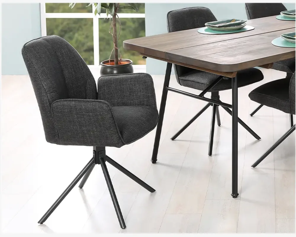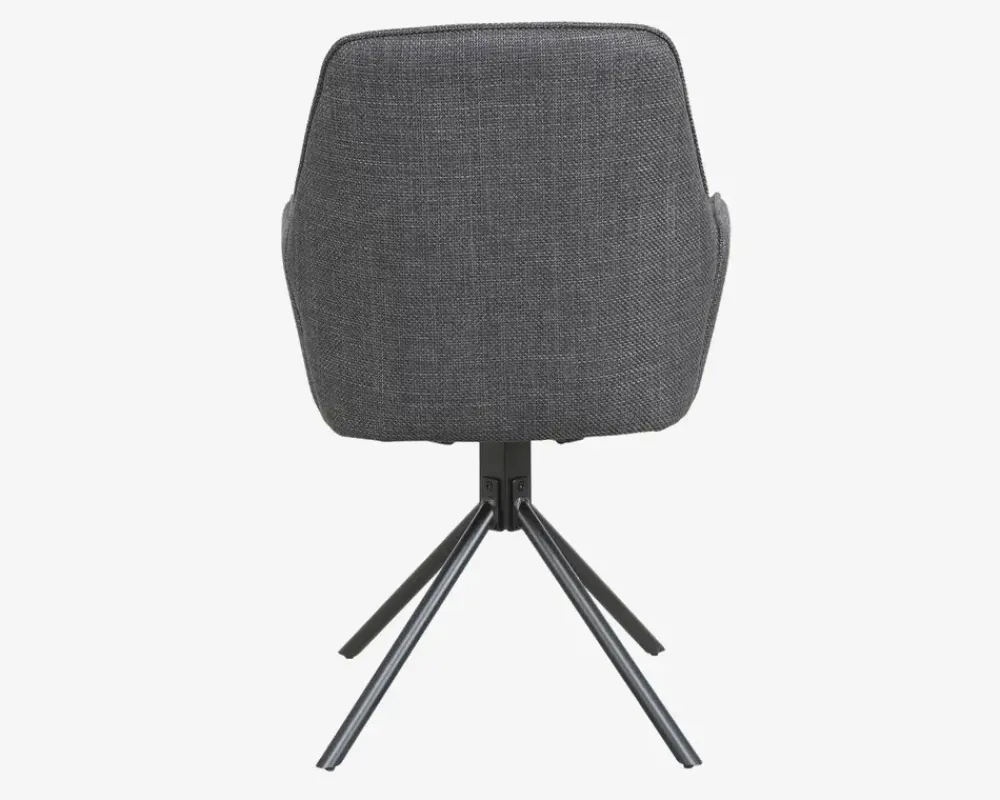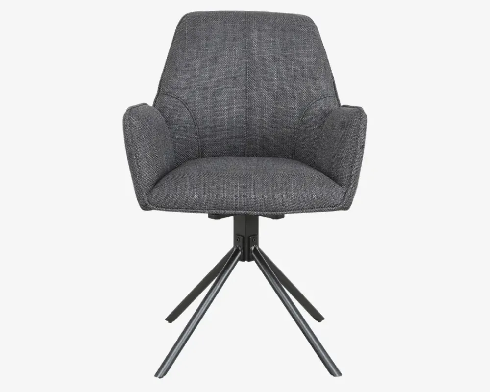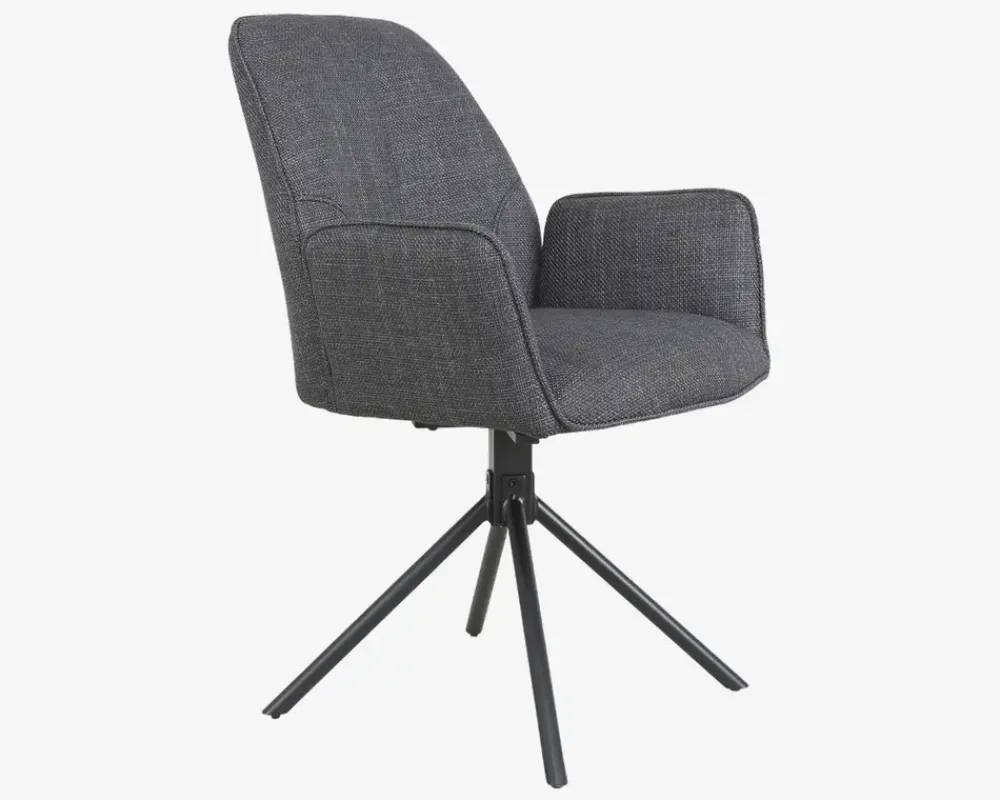 Her har du en flot spisebordsstol med armlæn og en fremragende siddekomfort. Spisestolene er fremstillet i kraftig gråt møbelstof, mens basen er i sort stål. Basen er en dreje base, som gøre stolen utrolig let at sætte sig i, og rejse sig fra selv om I sidder mange ved bordet. Basen har en “swing back” funktion, som betyder at stolen drejer tilbage til udgangspunktet når man slipper den, dette skal man naturligvis være opmærksom på, så man kan undgå eventuelle fald skader, fordi sædet ikke er der hvor man regner med.Spisebordsstolen kræver ingen vedligeholdelse, og rengøres med en klud vredet om i rent vand. Du bør være opmærksom når du støvsuger, så du undgår at ridse stellet. Spisestolen findes også uden armlæn, så du har mulighed for at kombinerer rundt om bordet.