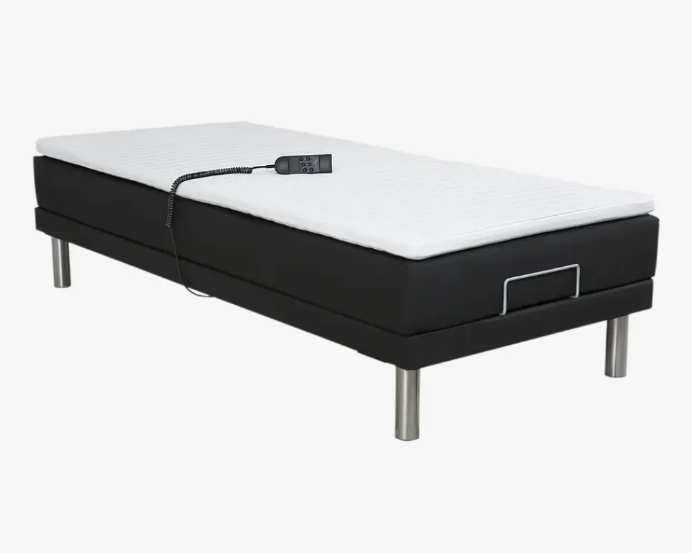Prisbillig elevationsseng i Dansk kvalitet. Vi har her sammensat en elevationssæt, som både lever op til en høj kvalitet, og som samtidig er en af de mest konkurrencedygtige elevationssæt på marked. Sættet består af 1 elevationsbund i 90 x 200 cm, 1 stk. 5-zonet springmadras 90 x 200 cm, samt 1 topmadras i 90 x 200 cm. Du har både mulighed for at benytte dette elevationssæt i en sengeramme, enten hvis du allerede har en, og kun ønsker at udskifte bund og madras, eller du kan kombinerer sættet med en af vores mange sengerammer. Hvis du ikke ønsker en sengeramme omkring madrassen, har du også mulighed for at monterer ben under selve lamelbunden, ved hjælp af et sæt hjørnebeslag som monteres direkte på rammen.Den polsteret lamelbund er 8 cm høj, og bygget op på en ramme i fyrretræ. Den har 28 lameller, hvor de 5 lameller omkring hoften er dobbelt lameller, som sikre at du kan justere hårdheden, efter den komfort du søger, eller din vægt. Lamelbunden har nakke og knæ knæk, for at øge komforten, når du læser eller der fjernsyn.Den vendbare springmadras er inddelt i 5 komfortzoner, for at give din krop den bedst mulige støtte igennem hele natten. Madras har 250 posefjedre pr. m². som alle vil være medvirkende til at du får en god støtte til hele kroppen. Det er vigtigt at du med jævne mellemrum 1-2 gange årligt vender madrassen, på den måde forlænger du levetiden på madrassen væsentligt, samtidig med at du hele tiden får det optimale ud af madrassen.Topmadrasserne er fremstillet i 30 mm polyetherskum, med quiltet betræk i slidstærkt polyester stof. Betrækket kan afmonteres og vaskes ved 30°. Vi anbefaler at du benytter en tynd skånemadras som kan vaskes ved 60°.• Lamelbund med 28 lameller, justerbar hårdhed i lænden• 5-zonet vendbar springmadras med 250 posefjedre pr. m²• 30 mm topmadras i polytherskum med quiltet betræk• Sælges ekskl. ben.• Bensæt 20 cm Nr. 11649. Hjørnebeslagssæt 11651. Du skal bruge 1 sæt af hver.• Mål i cm.: H.32 x B.90 x L.200• Leveres usamlet