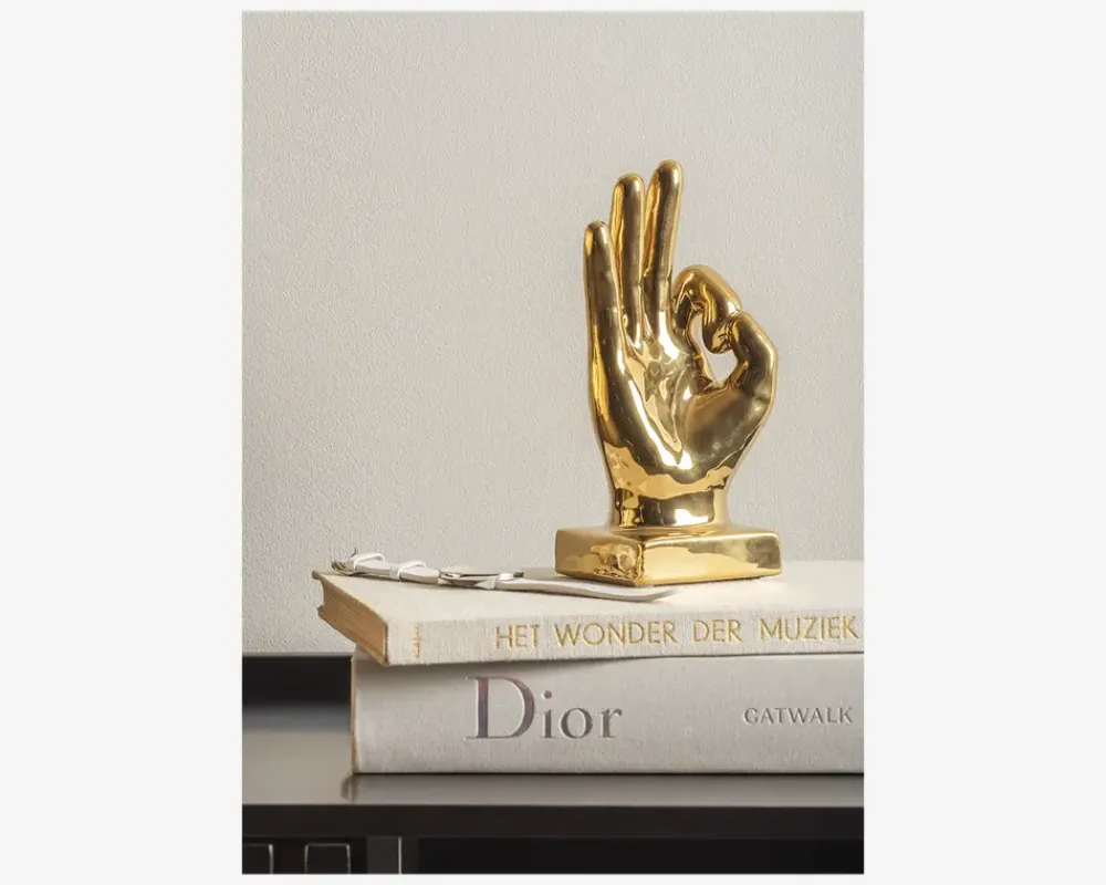 Dekorativ figur i en elegant guldfinish. Designet gør figuren til et unikt element i indretningen, hvor den kan placeres på en hylde, et skrivebord eller som en del af en dekorativ opstilling. Perfekt til at tilføje et personligt touch til hjemmet.