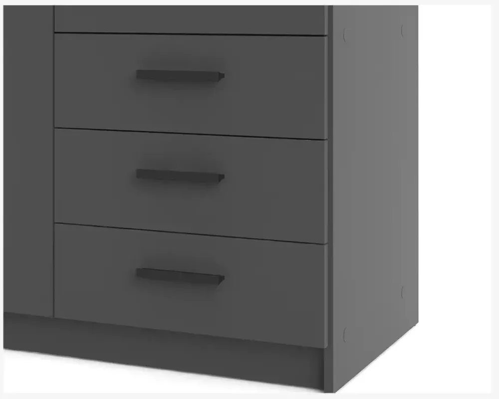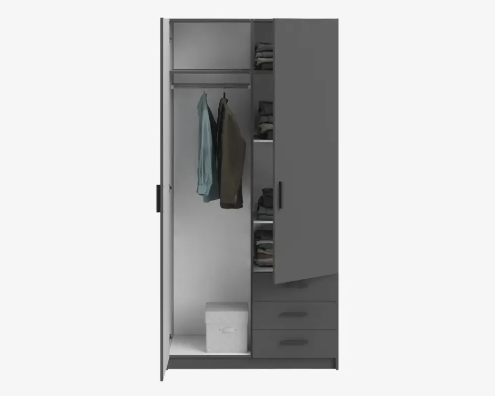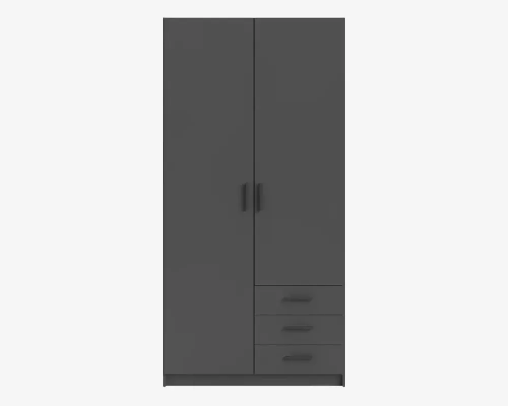 Sprint er en serie af garderobeskabe som findes i 3 størrelser og 2 farver. Sprint udmærker sig ved at være en serie af skabe i en god kvalitet, med kraftige sider, som holder til at blive brugt, og stadig sælges til gode priser. Skabene leveres komplet med indretning, og der kan ikke tilkøbes ekstra hylder til skabene. Vi lagerfører skabene i alle 3 størrelser i hvid og grå kunstfiner.Dette Sprint skab er særligt velegnet til børne eller ungdomsværelset, men også i den lille lejlighed alle sommerhuset, hvor behovet for opbevaring af tøj er mindre. Skabet her måler 99 cm i bredden, og indeholder 2 rum som begge er 47 cm i bredden, i den ene side har du 3 skuffer, og bag lågen over skufferne er der som standard 2 hylder. Du bestemmer selv om du ønsker skufferne til højre eller venstre, du er dog nødt til at tage beslutningen før du samler skabet, da det ikke er muligt at ændre efterfølgende. I den høje del af skabet har du en bøjlestang, og øverst i skabet har du en gennemgående hylde, som ikke kan flyttes. Det er ikke muligt at tilkøbe ekstra hylder. Skabet kan kombineres med de øvrige skabe i serien, hvis du har behov for mere skabsplads. • Grå kunstfiner• Komplet med indretning• 2 løse hylder, 1 gennemgående fast hylde, 3 skuffer og 1 bøjlestang• Mål i cm.: H.200 x B.99 x D.50• Leveres usamlet