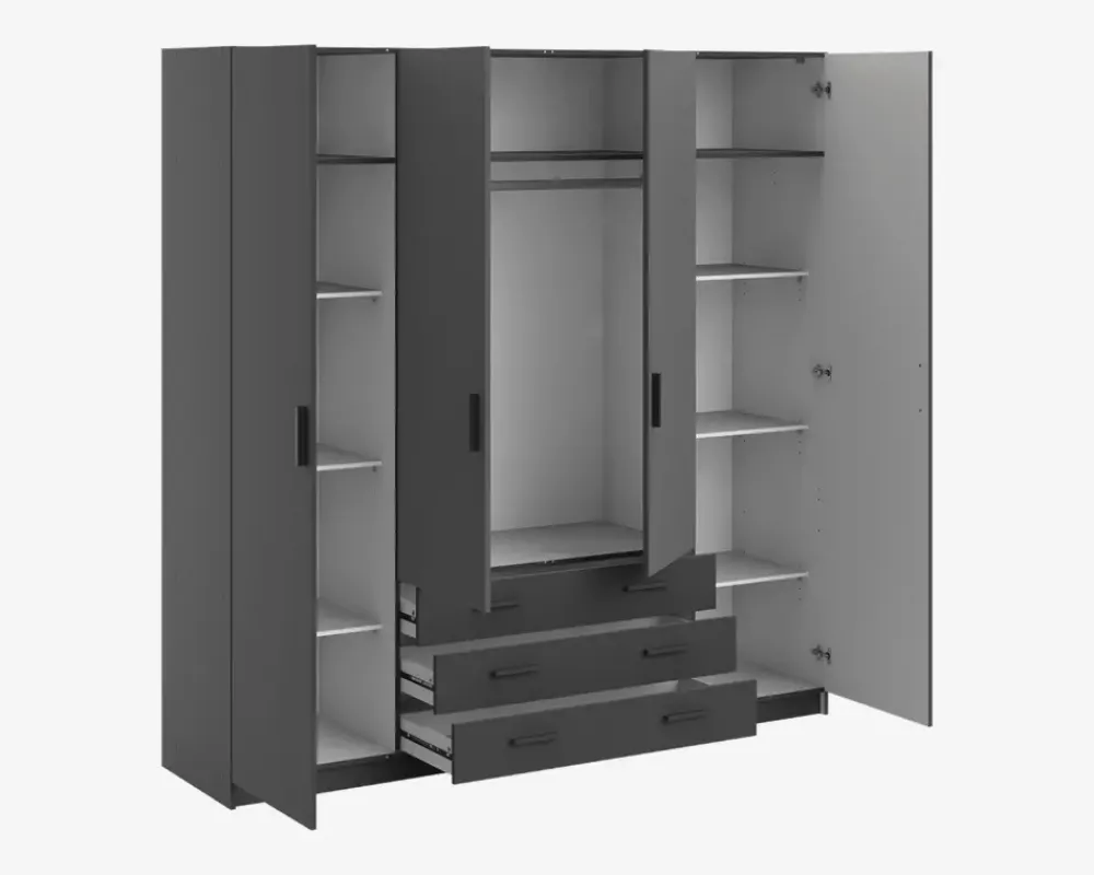 Sprint er en serie af garderobeskabe som findes i 3 størrelser. Sprint udmærker sig ved at være en serie af skabe i en god kvalitet, med kraftige sider, som holder til at blive brugt, og stadig sælges til gode priser. Skabene leveres komplet med indretning, og der kan tilkøbes ekstra hylder til det brede rum i skabet, sælges i pakker af 2 stk. Vi lagerfører skabene i alle 3 størrelser i hvid og grå kunstfiner.Dette Sprint skab er særligt velegnet til dig som har masser af tøj, men kun begrænset plads til et garderobeskab. Skabet her måler 196 cm i bredden, og indeholder 3 rum. To rum på 47 cm i bredden, begge indeholder 3 løse hylder. Rummet over skufferne måler 96 cm, og indeholder en bøjlestang. Skufferne skal placeres i midten af skabet som på billedet. Øverst i skabet har du en gennemgående hylde, som ikke kan flyttes. Skabet kan kombineres med de øvrige skabe i serien, hvis du har behov for mere skabsplads. • Grå kunstfiner• Komplet med indretning• 6 løse hylder, 1 gennemgående fast hylde, 3 skuffer og 1 bøjlestang• Ekstra hyler til det brede rum kan tilkøbes, pakke med 2 stk. varenr. 19504• Mål i cm.: H.200 x B.196 x D.50• Leveres usamlet