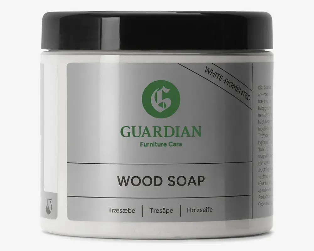 Guardian træsæbe, hvidpigmenteret anvendes til beskyttelse og pleje af ubehandlet eller sæbebehandlet træ hvor der ønskes en hvidpigmenteret overflade. Produktet er kogt på palmekerneolie og kokosolie og indeholder hverken parfume, farve, optisk hvidt eller blegemiddel. Træsæben er færdigblandet og klar til brug.