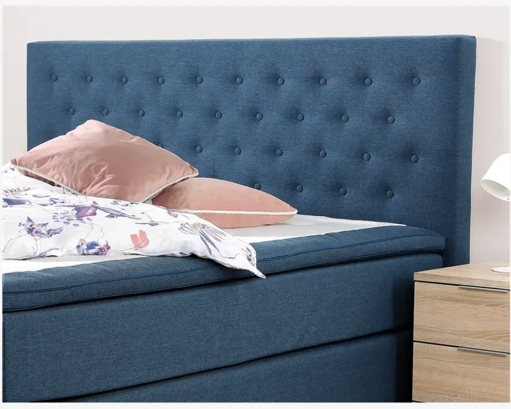 Her har du en løs hovedgavl i 180 cm. Gavlen er fremstillet i blåt møbelstof, og de 38 nedtrukne knapper er med til at give hovedgavlen et både smart og tidløst design, som kan passe ind i mange soveværelser. Sengegavlen er designet til at så løst op af væggen, bag madrassen, den er således ikke velegnet til en madras de står frit i rummet.Hovedgavlen skal ikke vedligeholdes, og den rengøres med en klud vredet op i rent vand, hvis ikke almindelig støvsugning er nok. Gavlen leveres samlet.• Løs hovedgavl til box- eller continental madras• Farve: blå• Står løst bag madrassen• 38 nedtrukne knapper• Betræk: 100% polyester• Mål i cm H.130 x B.180 x D.12• Leveres samlet