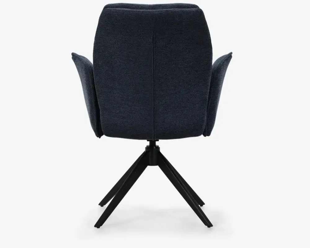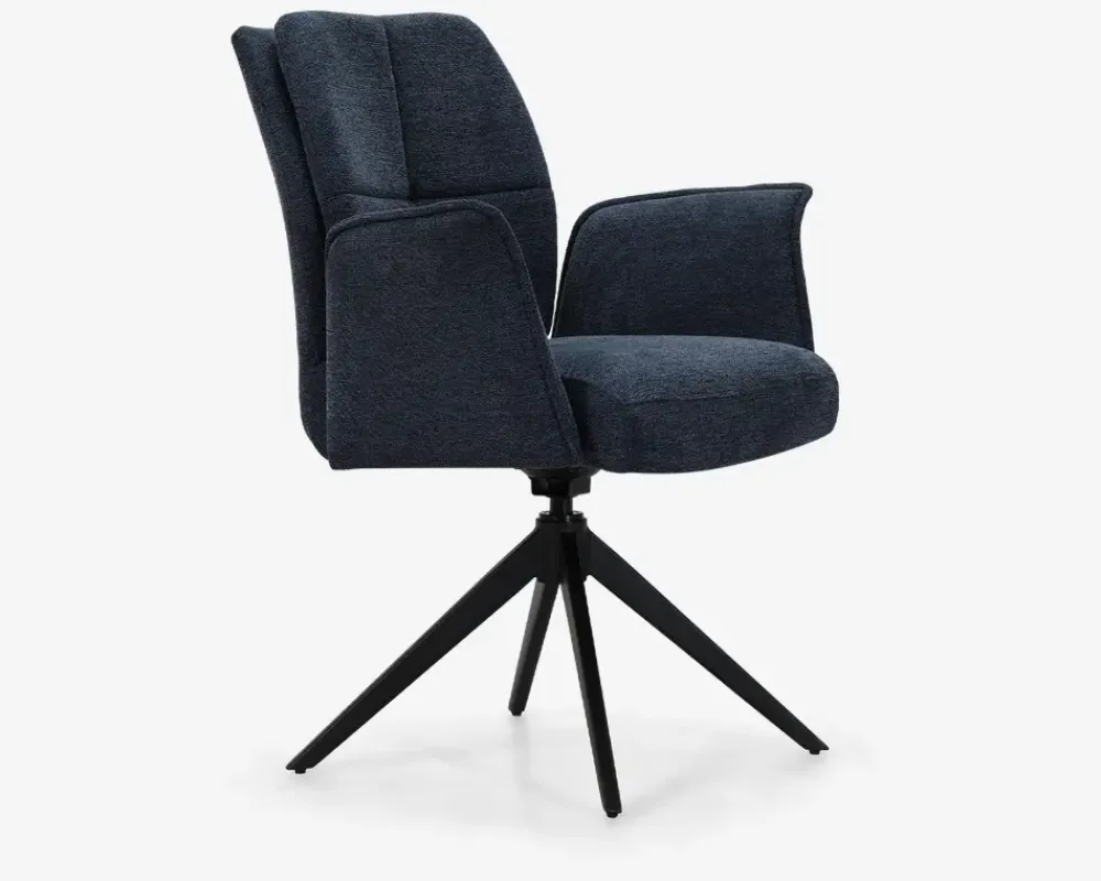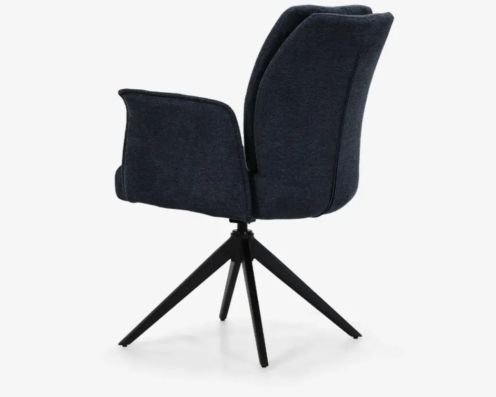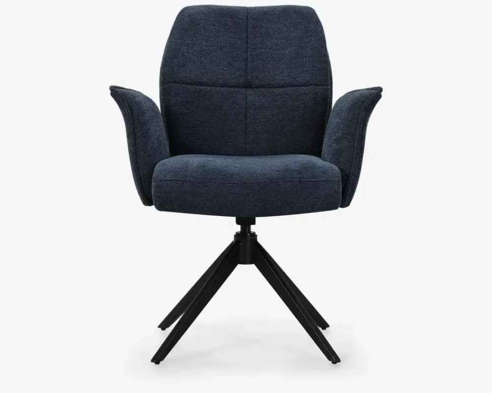 Spisestuestol i kraftig flot møbelstof. Stolen har nogle gode og brugbare armlæn, som man har glæde af, både når man spiser, men også når man hygger sig efter maden. Stolens flotte blå farve, kan være med til at løfte indretningen i hjemmet, og designet passer perfekt sammen med de moderne plankeborde. Stolen kan roterer 360° så selv om der er trangt ved bordet, kan du nemt komme op.Stolen sælges i pakker af 2 stk., den leveres usamlet, men er ikke svær at samle, hvis du følger den vedlagte samlevejledning. Spisebordsstolen kræver ingen vedligeholdelse, og rengøringen foretages med en klud vredet op i rent vand. Højde til overkant armlæn: 68 cm