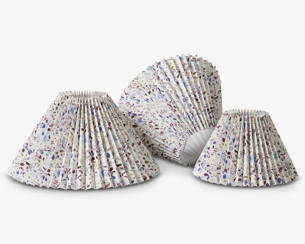 Plissélampeskærm af plastik, som vil skabe liv og hygge i hjemmet, da skærmen har et fint blomsterprint. Lampeskærmen sættes på ved at to metalbøjler inde i lampeskærmen klikkes ned over pæren.