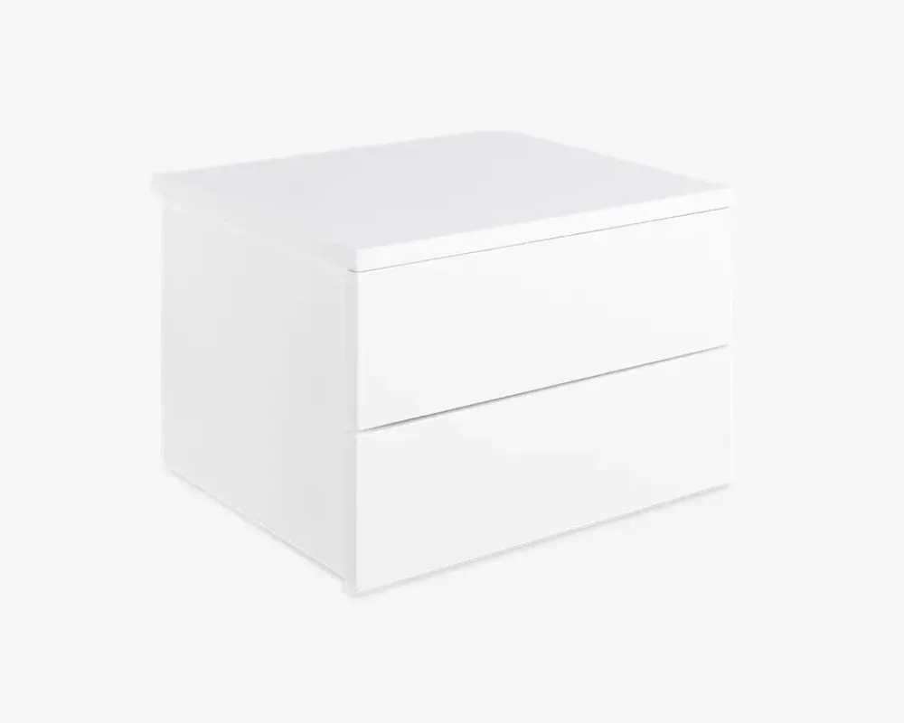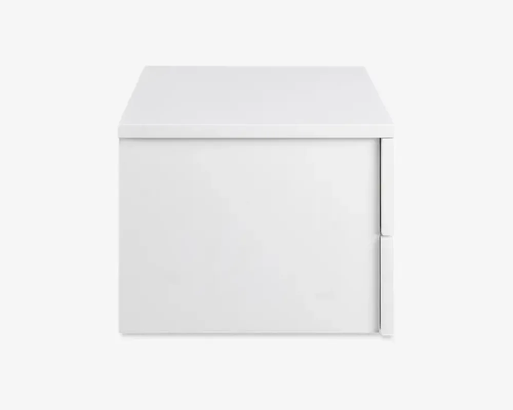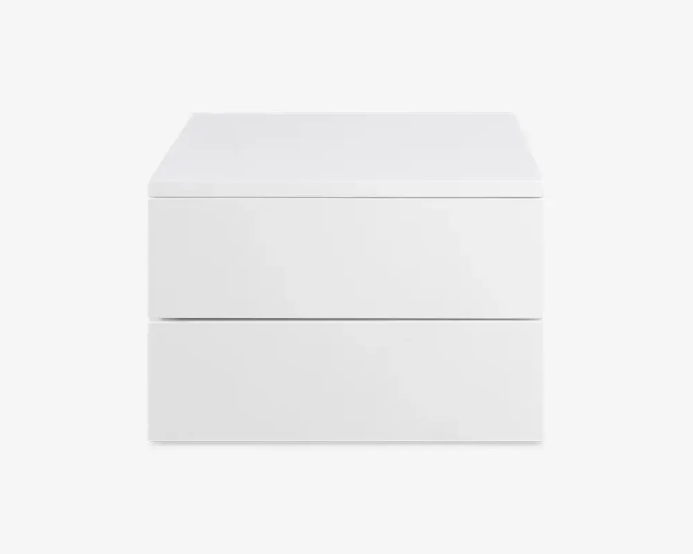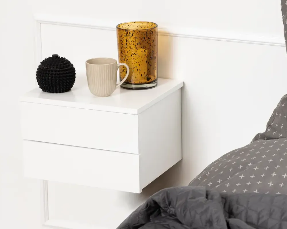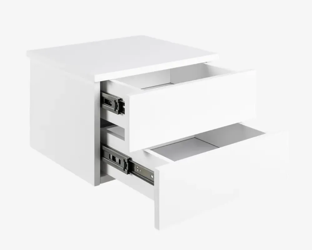 Væghængt senge bord som dette, er perfekt, det letter rengøringen, hvilket er praktisk i et soveværelse. Sengebordet har et minimalistisk design, med rene linier, og passer derfor diskret ind i de fleste soveværelser. De 2 skuffer giver dig mulighed for at opbevare alt, fra godnat læsningen, briller, medicin, du bestemmer helt selv.Sengebordet er fremstillet i hvid lakeret MDF, og kræver ingen vedligeholdelse, rengøringen foretages med en klud vredet op i rent vand. Bemærk at overfladen kan ridses, så hvis du vælger at placere en natlampe på bordet, anbefaler vi at du benytter filtdupper.Leveres usamlet