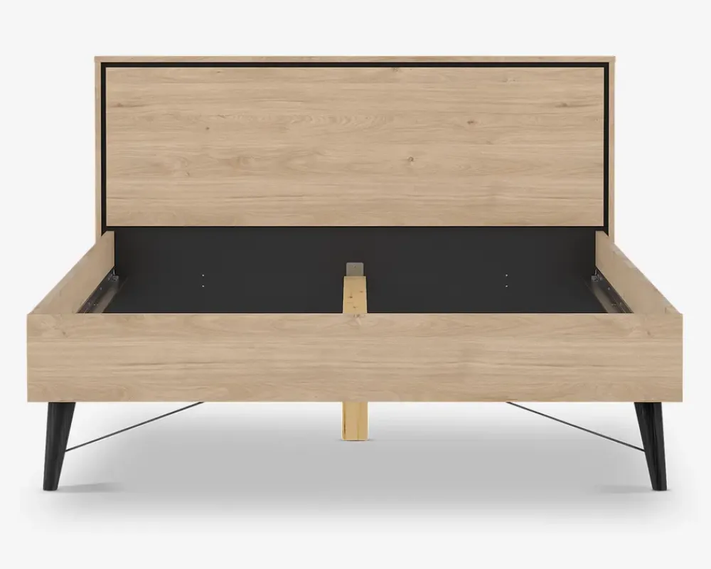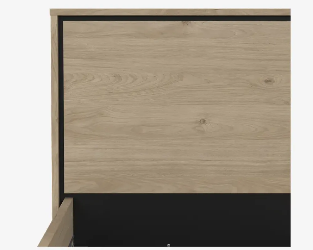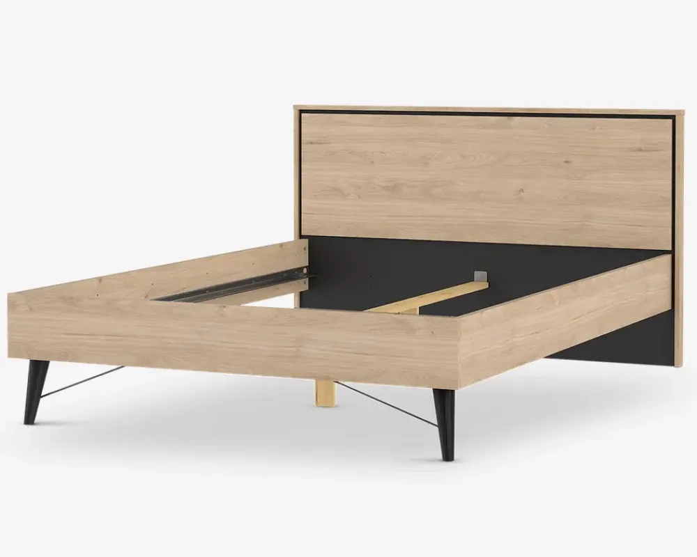 I den populære Ry serie til soveværelset, er der nu mulighed for at gennemfører indretningen så den passer sammen. Ry sengerammen er fremstillet i eg kunstfiner med sorte detaljer, og den passer perfekt sammen med kommoder, sengeborde og garderobeskab i samme serie. Sengerammen passer til et madras mål på B. 140 x L. 200 cm, og der kan både benyttes lamelbunde med springmadras, eller boxmadras. Sengerammen leveres usamlet, og vi anbefaler at I er 2 når sengerammen skal samles og flyttes. Sengerammen kræver ingen vedligeholdelse, og rengøringen foretages med en klud vredet op i rent vand.Hvis ikke du har bund og madras som du ønsker at genbruge, skal du huske at tilkøbe dette