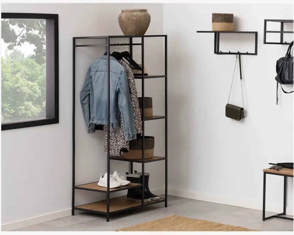 Seaford garderobestativet er perfekt til entreen, stativet har både bøjlestang og 5 hylder til fodtøj eller eller bluser. Endelig har garderobestativet også en hattehylde, så kort fortalt kan du få opbevarede alt i entreen med dette flotte møbel, som også er dekorativt. Garderobestativet kan også bruges til det smarte børne eller ungdomsværelse, hvor der er behov for ekstra opbevaringsplads til tøj.Garderobestativet leveres usamlet, men samles uden de store problemer, hvis du benytter dig af den medfølgende samlevejledning. Tøjstativet er nemt at holde rent, du aftørre blot fladerne med en klud vredet op i rent vand. Derudover kræver stativet ingen vedligeholdelse.