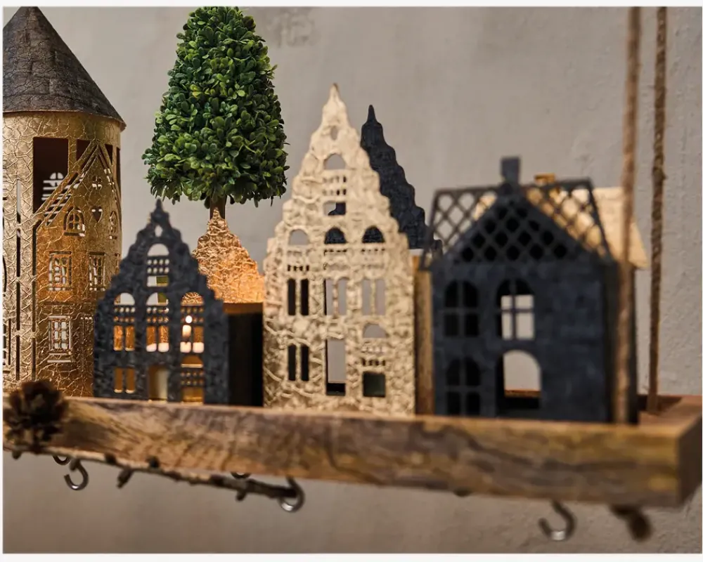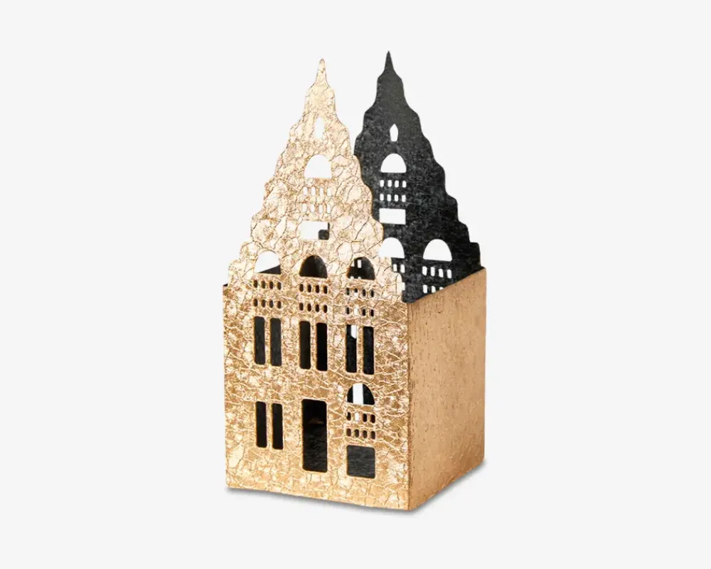 Dekorationshus til fyrfadslys i metal. Når lyset tændes, strømmer det blødt ud gennem husets små vinduer og skaber en hyggelig stemning. Perfekt at placere i vindueskarmen eller på en hylde.