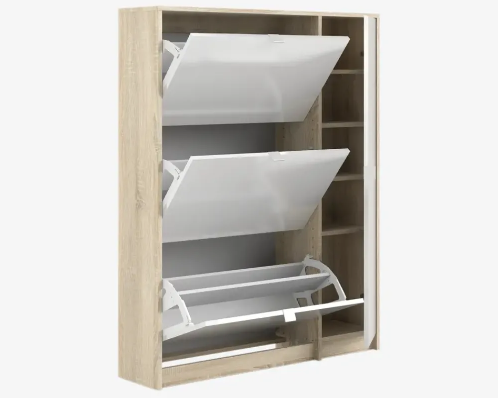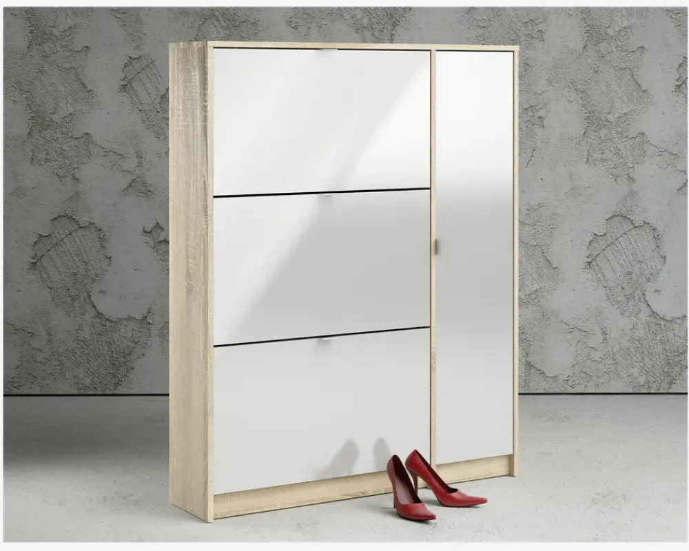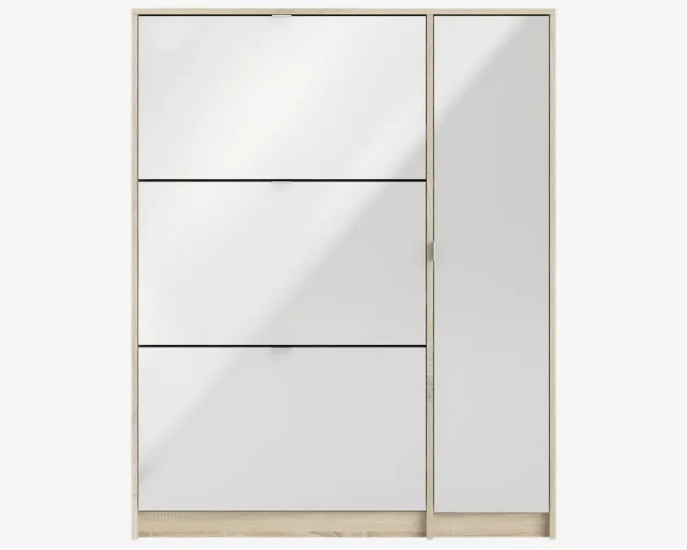 Et flot skoskab med 3 klaplåger, og 1 låge bag hvilken du finder 4 hylder. Skoskabet giver plads til 18 par sko i varierende størrelser. Hver låge har 2 rækker, så hvis du mangler opbevaringsplads til dine sko, har du her muligheden. Den almindelige låge gemmer på 4 hylder, som du både kan bruge til sko, hvis du ikke har plads nok, men de kunne også være oplagt til handsker og huer eller lignende. Skoskabet er en del af en serie bestående af skoskabe i forskellige størrelser, og de findes i flere forskellige farver, dette giver dig god mulighed for at finde en der passer hjem hos dig, uanset om det er størrelsen eller farven du ønsker at passe ind.Skoskabet er fremstillet i eg kunstfiner med front i hvid højglans Kunstfiner, som nemt rengøres, med en klud vredet op i rent vand. Der skal ikke bruges rengøringsmidler, er du uheldig og få et sål mærke på skabet, kan denne fjernes med en lille smule husholdningssprit på en klud. Sten og jord vil ridse skuffen indvendigt. Vi anbefaler grundet den lille dybde på skabet at det fastgøres til væggen, på den måde sikre du at skabet ikke vælter når du åbner den øverste låge. Skabet leveres usamlet, hvis du følger den vedlagte samlevejledning samles det nemt, men det tager lidt tid.• 4 hylder• Mål i cm.: H.123,6 x B.98,8 x D.24,05• Leveres usamlet