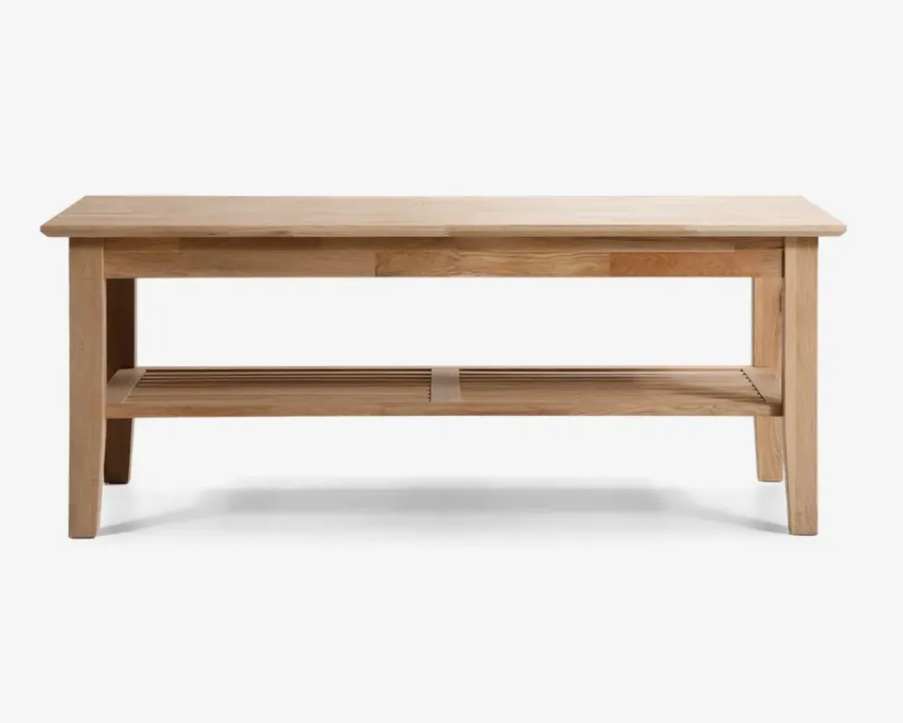 Klassisk sofabord i et enkelt og gedigent design. Under bordpladen er en smart hylde af massive tremmer til aflægning af blade, magasiner og andet så det ikke roder på selve bordet. Sofabordet er fremstillet af massivt olieret egetræ. Oliebehandlingen gør bordet nemt at vedligeholde og giver en smuk overflade.• Massiv olieret eg• Enkelt og gedigent design• Nemt at vedligeholde• Leveres usamlet, men samles nemt• Mål i cm. B.70 x L.130 x H.51