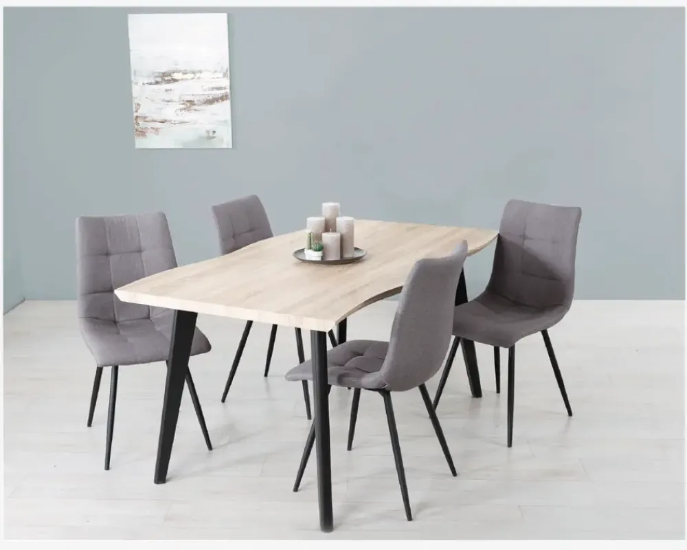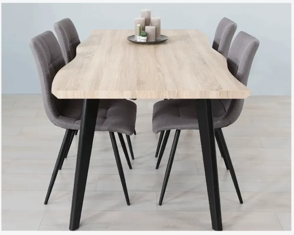 Her har du et lille smart spisebordssæt, som med sit antikke look passer fint ind i tidsbilledet. Sættet består af 1 spisebord i eg kunstfiner med sorte ben, samt 4 stole i slidstærkt møbelstof med sorte ben. Den bølgede bordkant giver et fint rustikt look. Kunstfineren udmærker sig ved at være hårdfør i forhold til både væske og varme, vi anbefaler dog fortsat at eventuelle spildte væsker tørres op hurtigst muligt, ligesom brug af varmebrikker anbefales når der placeres varme gryder eller lignende på bordet, derudover ridses overfladen ikke nemt. Det giver dig en robust overflade som du vil kunne glæde dig over, langt ud i fremtiden. De sorte ben er lakeret, de kan ridses, men som udgangspunkt er de meget robuste. Spisestuestolene er fremstillet med et betræk i 100% polyester, som både er slidstærkt og praktisk. Betrækket rengøres med en støvsuger, samt en klud vredet op i rent vand. Stolene sælges i pakker af 2 stk.Spisebordssættet kræver ingen vedligeholdelse, og rengøringen foretages med en klud vredet op med rent vand. Skulle din søn eller datter være uheldig med tussen, kan det fjernes med en smule husholdningssprit på en klud, undgå at hælde sprit direkte på bordet. Bordet er ridsefast og tåler en del varme, men vi anbefaler fortsat at du benytter dig af dækkeservietter og varmebrikker når du dækker op. Være opmærksom på at hvis der laves hul i kunstfineren kan bordet ikke repareres.• Mål i cm. på spisebord: H.75 x B.90 x L.160• Mål i cm. på spisestuestol: H.89 x B.46 x D.57 • Sædehøjde 47• Ekstra spisestuestole kan tilkøbes varenummer 19548, sælges i pakker af 2 stk.• Leveres usamlet.