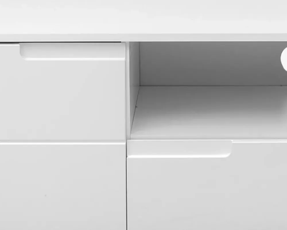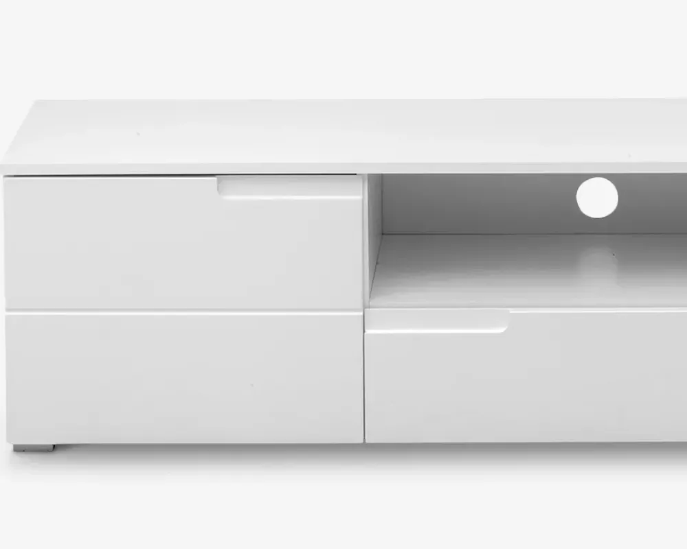 Tv-bord i et smart og moderne design. Det leveres med 2 skabe og 1 stor og rummelig skuffe, som er kendetegnet ved at de er grebsfri. Tv-bordet er i hvid/hvid højglans kunstfiner. Leveres usamlet men samles let.• Hvid/hvid højglans kunstfiner• Rigtig god plads• 2 skabe og 1 stor skuffe• Leveres usamlet men samles let• Mål i cm. B.165 x D.40 x H.42