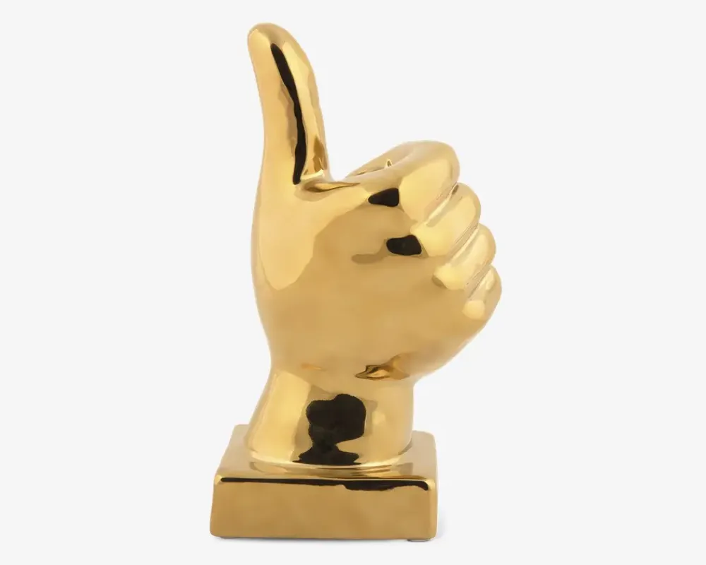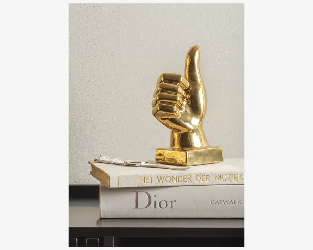 Dekorativ figur i en elegant guldfinish. Designet gør figuren til et unikt element i indretningen, hvor den kan placeres på en hylde, et skrivebord eller som en del af en dekorativ opstilling. Perfekt til at tilføje et personligt touch til hjemmet.