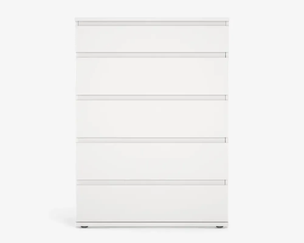 Denne kommode er en del af en kommode serie, som findes i forskellige størrelser. Denne kommodeserie er til dig som går op i de små detaljer, men samtidig har fokus på prisen. Du får i denne serie en flot kommode, hvor skufferne kører let på metaludtræk. Skufferne er grebsfri og den hvide kunstfiner er foldet omkring kanten, så du ikke for nogen synlige samlinger, eller kantlister. Foldemetoden samt en 45 vinkel i skuffefronten giver en behagelig greb når du skal åbne skuffen. Alle enhederne i denne serie giver dig høj værdi for pengene, og de er særdeles konkurrencedygtige i forhold til kvaliteten.Denne kommode har 5 rummelige skuffer. Den måler H.106,6 x B.76,8 x D.40 cm. Skufferne kører på metaludtræk med indbygget stop, så du ikke risikerer at tabe skuffen på gulvet. Kommoden leveres usamlet, men samles let, hvis du følger den vedlagte samlevejledning. I samme serie findes en bred kommode med 3 skuffer, en smal kommode med 5 skuffer, en dobbelt kommode med 3+3 skuffer, samt et sengebord med 2 skuffer.• Metaludtræk med stop• Hver skuffe kan bære 9 kg• Topplade kan bære 15 kg• Mål i cm: H.106,6 x B.76,8 x D.40• Leveres usamlet