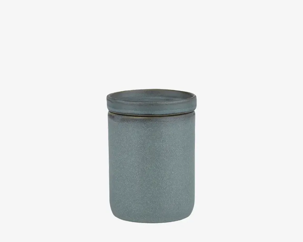 Krukke i en smuk blålig glasur som har flere forskellige anvendelsesmuligheder. Krukken kan bruges til opbevaring af vatrondeller, vatpinde, smykker eller noget helt fjerde. Krukken kan nemt kombineres med andre dele af serien så du kan fuldende indretningen på badeværelset, soveværelset eller hvor du nu synes den passer ind.