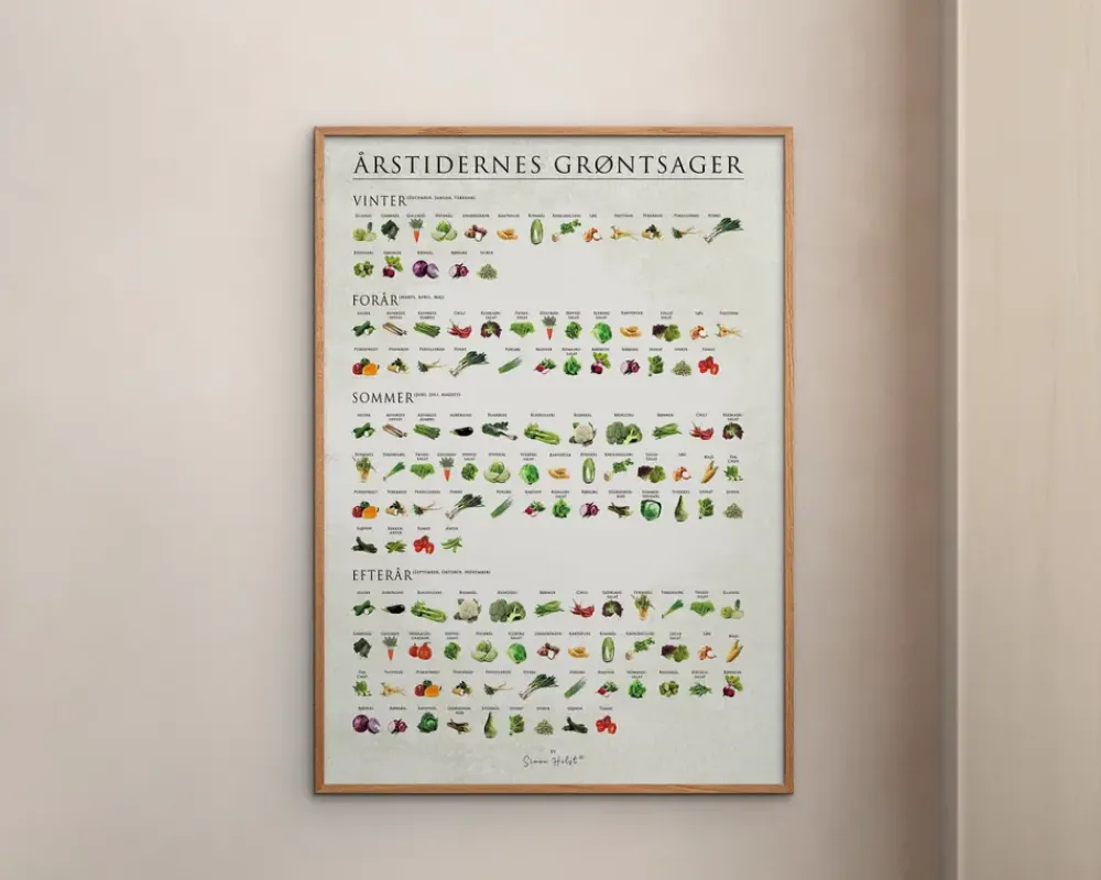 Få en smuk og funktionel oversigt over sæsonens grøntsager med denne dekorative plakat, der kombinerer æstetik og praktisk viden. “Årstidernes Grøntsager” præsenterer en farverig og stilfuld illustration af grøntsager inddelt efter deres sæson, så du nemt kan planlægge måltider med friske råvarer året rundt.