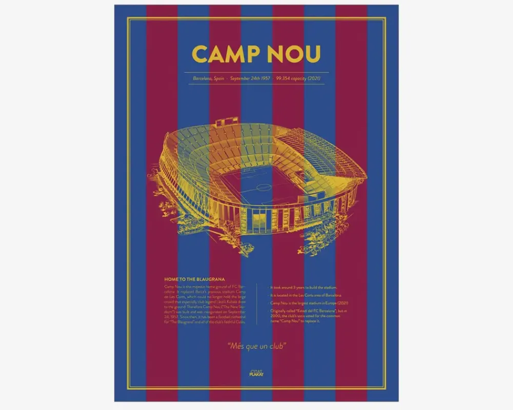 Hyld FC Barcelonas legendariske stadion med denne smukke plakat af Camp Nou. Plakaten fanger essensen af en af verdens mest ikoniske fodboldarenaer og er perfekt til enhver fan af klubben eller sporten. Med et stilrent design og iøjefaldende detaljer er den en ideel tilføjelse til hjemmet, kontoret eller fankælderen.Plakaten måler 50×70 cm og er trykt på papir af høj kvalitet for at sikre klare farver og en flot finish. Uanset om du har besøgt Camp Nou eller blot drømmer om det, er denne plakat en fantastisk måde at fejre fodboldens magi på.