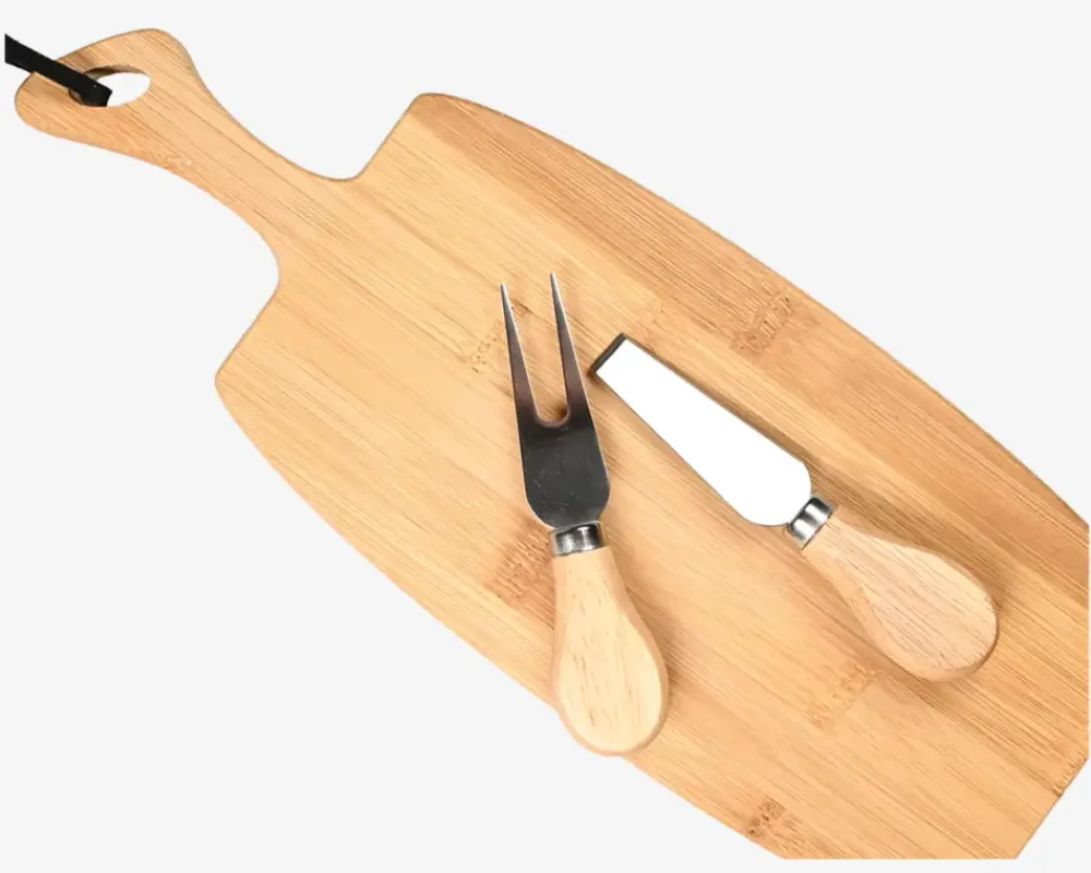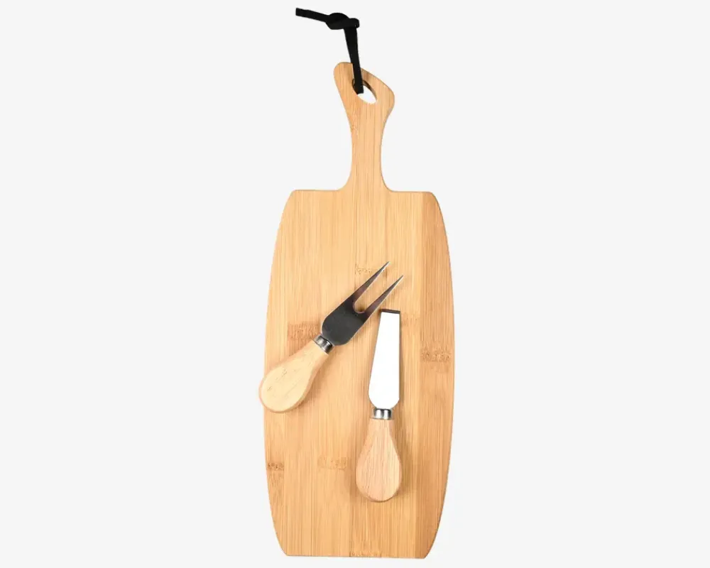 Skærebræt med to osteknive i et enkelt design. Brættet måler B.13 x L.34 cm og er lavet i bambus, mens knivene er i metal. Perfekt til servering af ost og snacks til gæster eller til en hyggelig aften.