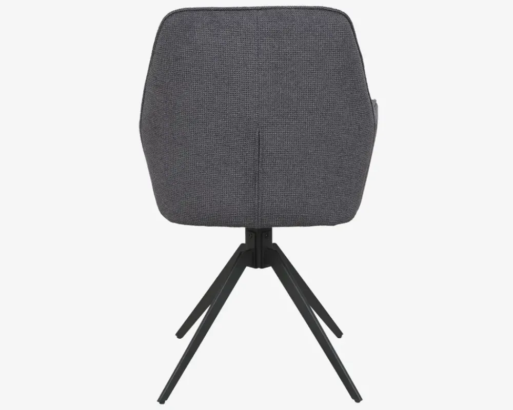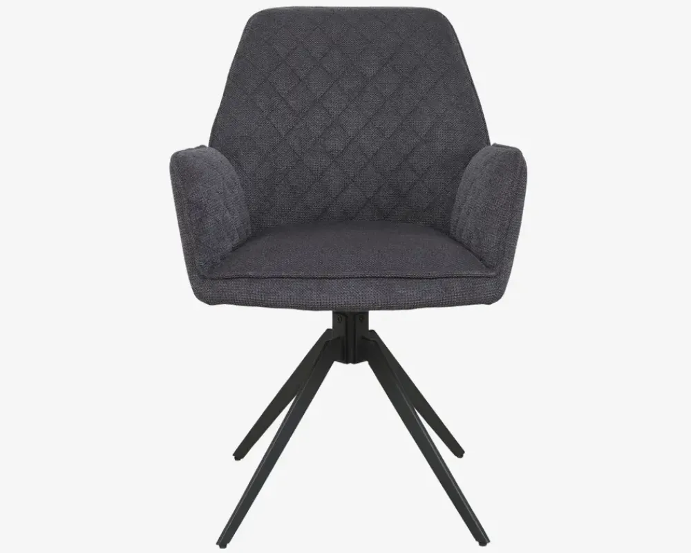 Flot designet spisebordsstol med armlæn og drejefod. Stolen tilbyder en god siddekomfort, både fordi ryggen er høj, sædet er bredt, og armlænene en tilpas højde til at understøtte en god siddekomfort, som vil glæde dig dag efter dag. også når aftenen bliver hyggelig og trækker ud. Det er takket været drejet i soklen også nemt både at sætte sig i stolen, og komme op hvis man trænger til en pause under middagen. Stolen er fremstillet med slidstærkt stof i polyester, og drejestel i sort pulverlakeret stål. Spisebordsstolen kræver ingen vedligeholdelse, og holdes ren med en klud vredet op i rent vand. Stolen sælges i 2 stk´s og leveres samlet. Klar til brug når du har taget dem ud af kassen.Vær opmærksom når du rejser dig fra stolen, med swingback funktionen drejer sædet tilbage til udgangs postionen, og du risikerer at sædet ikke befinder sig der hvor du regner med, når du skal ned og sidde.