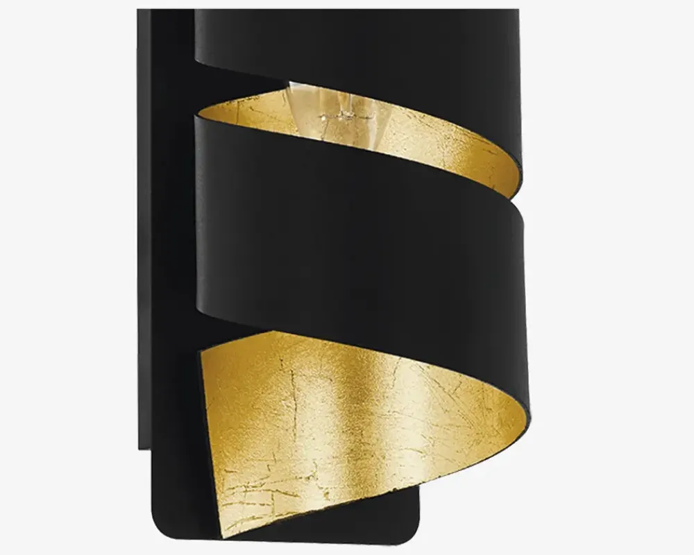 Fin lille væglampe i sort metal med rustik guldfarvet indvendig belægning, som reflektere lyset flot ud af den snoet skærm. Elizondo kan bruges lige hvor du ønsker, fx som sengelampe eller som ekstra belysning i entreen.Kombinér evt. med andre lamper fra sortimentet og skab din helt egen personlige indretning.• Mål i cm.: H.27 x Ø.11,5 • Materiale: Metal• Fatningstype: E14 maks 40W• Inkl. Lyskilde: Nej• IP-kode: IP20• Ekskl. Ledning