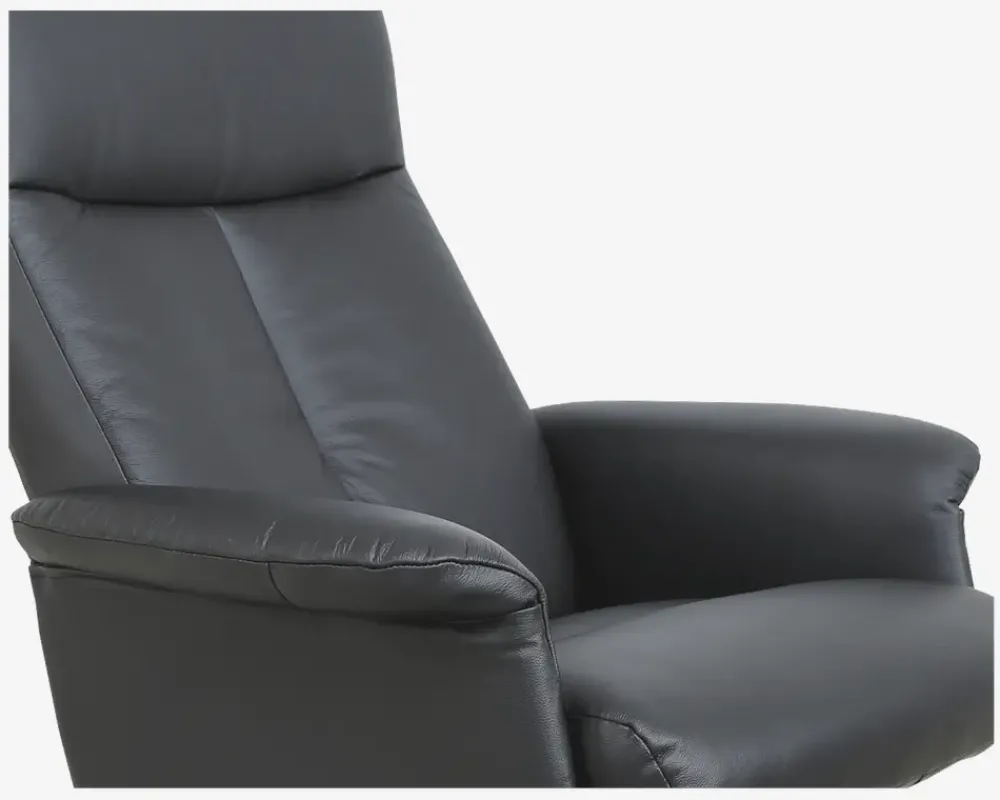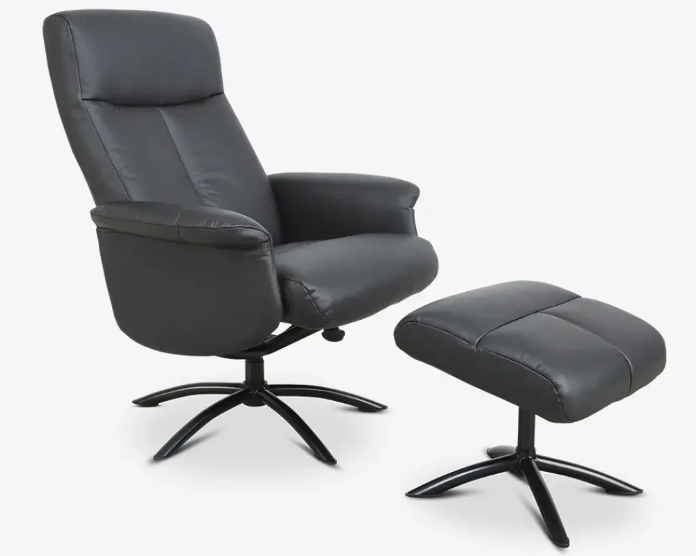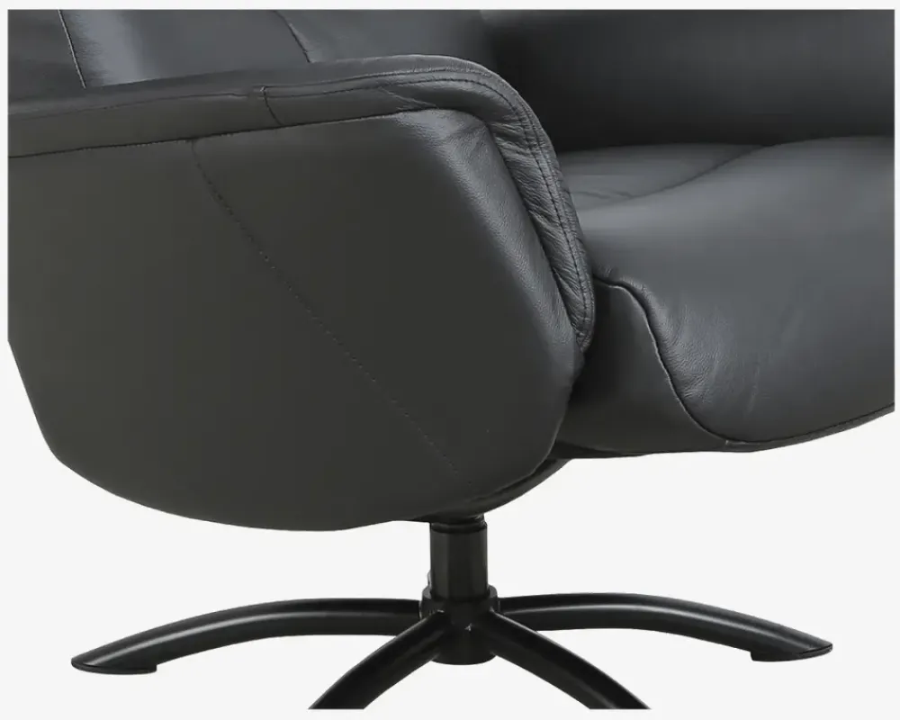 Super lækker drejestol i et flot design. Stolen leveres med fodskammel. vippefunktion i ryggen betjenes ved hjælp af et lille håndtag som sidder lige under forkant på sædet. Her kan hårdhed af funktionen reguleres, så den helt perfekte stilling kan opnås. Stolen er monteret med sort okselæder på alle slidflader og har en flot sort lakeret metalfod. Stolen har formstabilt polyether skum i både sæde og ryg, hvilket giver en rigtig god siddekomfort og en god holdbarhed. Denne stol er en del af vores egen stoleserie ”Sit-WELL”. Denne stoleserie er udviklet med en af vores ypperste leverandører af hvile- og drejestole. Serien består af 4 stole som er ens i udseende men forskellig i funktion. Dette er den første i rækken af stole.• Inkl. fodskammel• Dreje og vippefunktion• Lækkert sort okselæder på alle slidflader• Rigtig god siddekomfort• Sortlakeret metalfod• Mål i cm: B.78 x D.70 x H.47/105