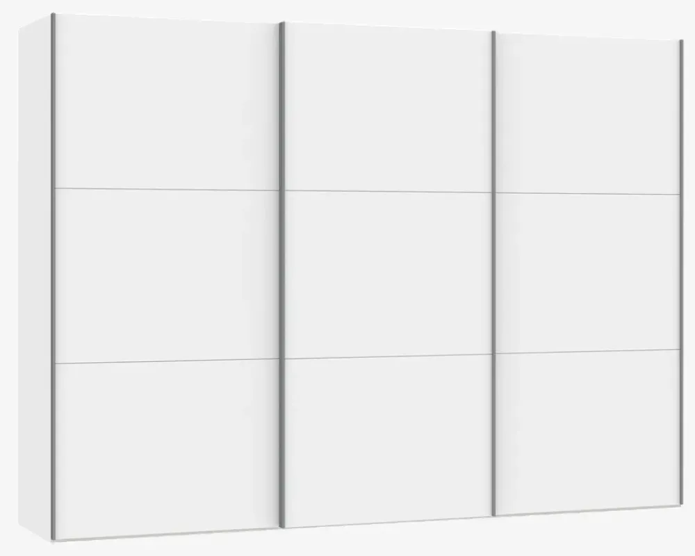 Her har du et garderobeskab i absolut topkvalitet. Skabet er fremstillet af en af de dygtigste garderobeskabs producenter i Europa, som ligger i Schweiz. Du kan mærke det når du åbner og lukker dette skab, lågerne kører let og ubesværet, og skabet står stabilt når det først er samlet. Skabet kan uden problemer samles og adskilles flere gange, så det vil også være muligt at bringe dette skab med videre når du flytter. Skabene fra denne leverandør findes i mange forskellige mål, vi har valgt at lagerføre 3 forskellige størrelser, men hvis ikke de dækker netop dit behov, er du velkommen til at kontakte en af vores dygtige sælgere, som kan fortælle dig om mulighederne.Dette skab er inddelt i 3 lige store rum, som er omkring 100 cm brede, og standard indeholder en hylde og 1 bøjlestang. Udover standard indretningen har du mulighed for at vælge ekstra indretning så du tilpasser skabet til netop dit behov. Alt tilbehør fra vores Swiss garderobeskabsserie, passer således til dette skab. Skabet er nemt at rengøre og kræver ingen vedligeholdelse. Vi lager fører skabet som her, men også i bredde 152 cm med hvide højglans låger og i bredden 202 cm med 1 hvid højglans låge og 1 spejllåge.• Indeholder 3 hylder og 3 bøjlestænger• Masser af mulighed for ekstra tilbehør• Kan skilles og flyttes uden problemer• Mål i cm: H.220 x B.303 x D.65• Leveres usamlet