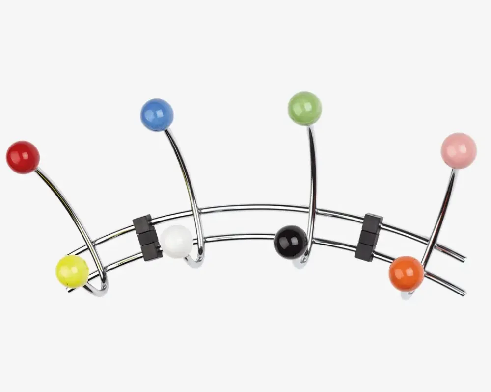 Flot krom knagerække med 8 multifarvet knopper. Passer perfekt ind i gangen eller bryggerset til ophæng af overtøjet.Der medfølger skruer og rawplugs til ophæng.