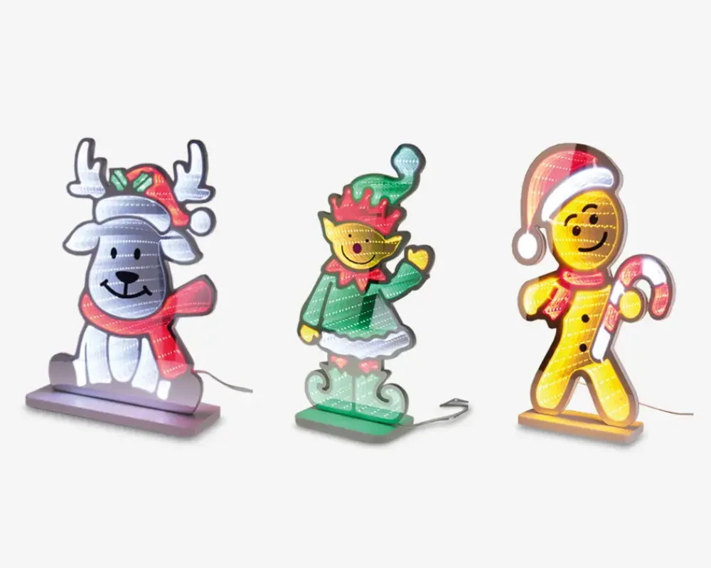 Dekorativ figur med infinity-effekt og farvede LED-lys, der skaber en livlig og festlig stemning der er perfekt til juledekorationen. Figuren er beregnet til indendørs brug og leveres med en 5 meter ledning samt 12V transformer. Ideel som blikfang i stuen, på børneværelset eller som del af en stemningsfuld juleopstilling.Bemærk at den kommer assorteret, købes enkeltvis og at der ikke kan vælges design ved køb i webshoppen.Forventet hjemme i uge 45.