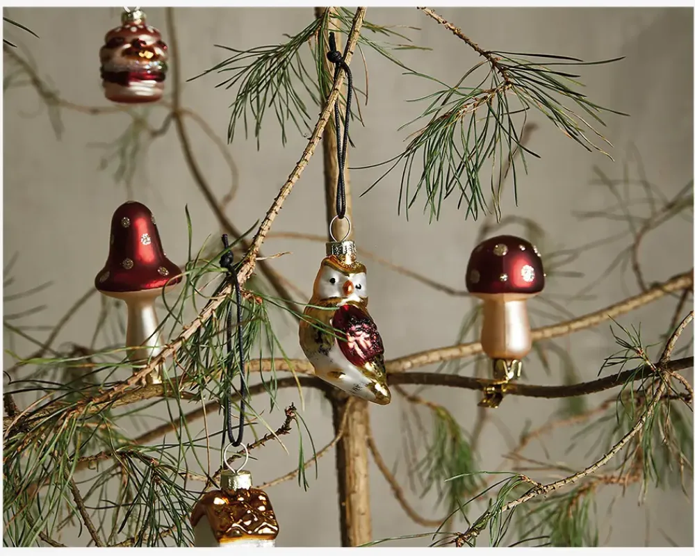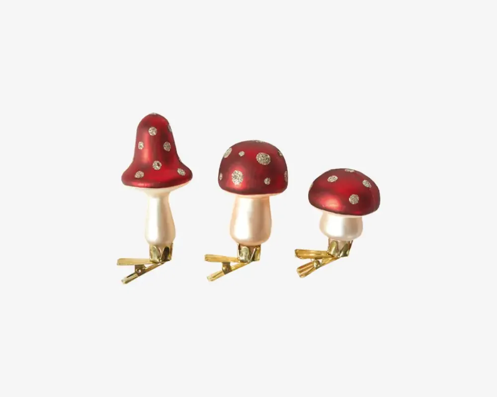 Charmerende dekorations svampe med klips. Hvert svampeornament er lavet af glas og kommer i en kombination af rød, offwhite og guldglimmer. Placer disse fine svampe med klips på juletræet, i en dekorativ krans eller på en julegren for at skabe en hyggelig og stemningsfuld atmosfære i dit hjem. Højde og bredde varierer afhængigt af model. Bemærk, at de kommer assorteret, købes enkeltvis og at der ikke kan vælges model ved køb i webshoppen.Mål i cm: H.4-8 x B.3,5-4