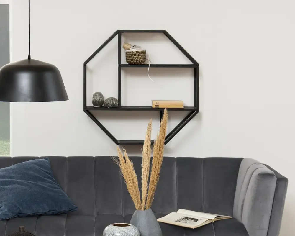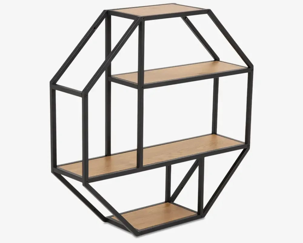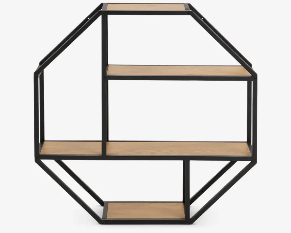 Smart, enkel og moderne 8-kantet vægreol til ophæng. Er let og elegant og med sit asymmetriske udtryk kan den rumme mange ting på en spændende måde. Reolen er lavet med et sort lakeret metalstel, som gør at reolen kan bære det meste. Hylder er i vild eg melamin. Reolen leveres usamlet men samles nemt.I denne serie kan der fås mange forskellige møbler, som gør det muligt at møblere de fleste rum i hjemmet med lige netop denne serie. Serien består af meget ”lette” møbler som kan give et enkelt og flot udtryk overalt i hjemmet. Flere typer sofaborde, tv-borde, reoler, serveringsvogne, skriveborde. Me denne serie er det nemt at indrette sig hyggeligt og praktisk på samme tid.• Enkel og moderne 8-kantet vægreol• Vild eg kunstfiner hylder• Sortlakeret metalstel• Asymmetrisk udtryk• Leveres usamlet, men samles nemt• Mål i cm. B.77 x H. 77 x D.20