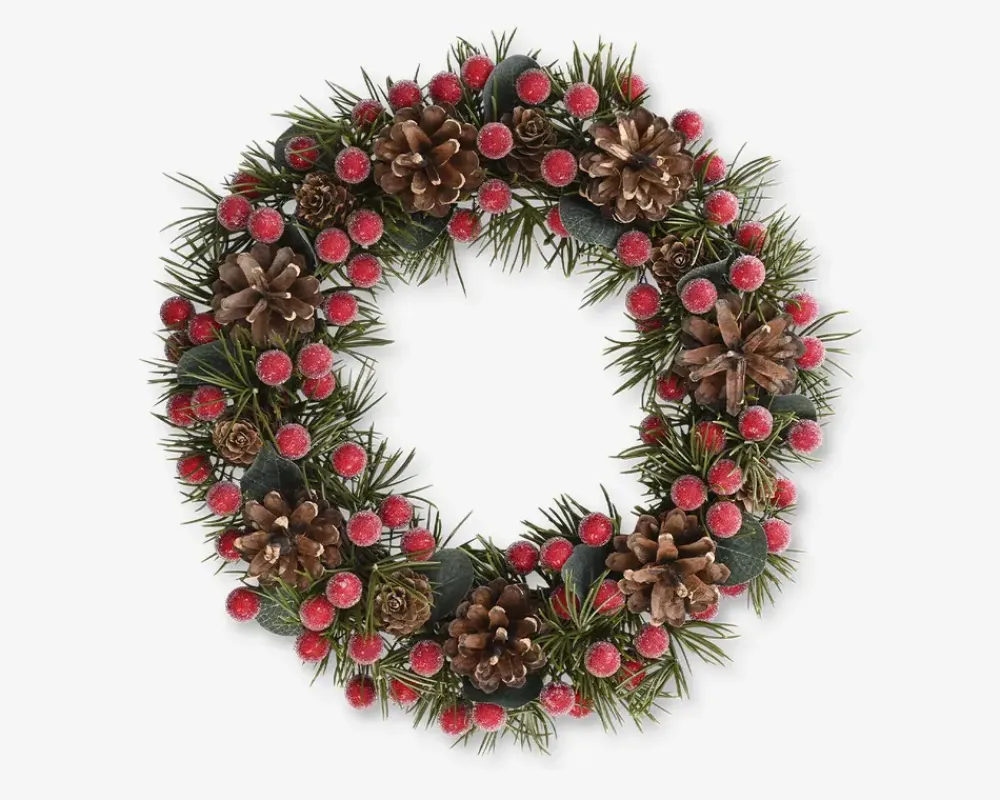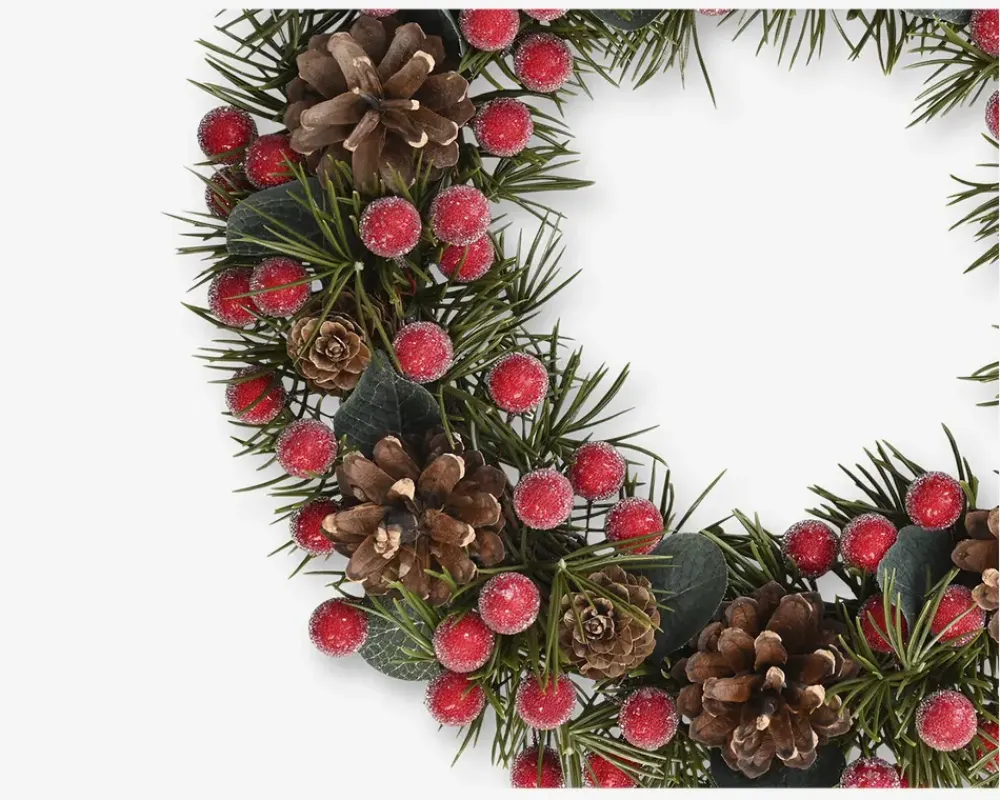 Julekrans med kogler, kunstig gran og røde bær til dekorationer, døren eller noget helt andet.Kransen tilføjer et strejf af julestemning og naturens charme til dit hjem, uden at du behøver bekymre dig om vedligeholdelse.