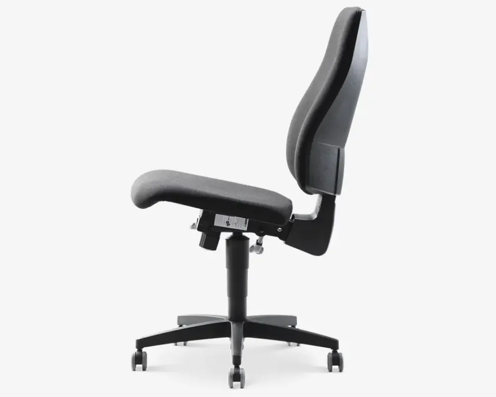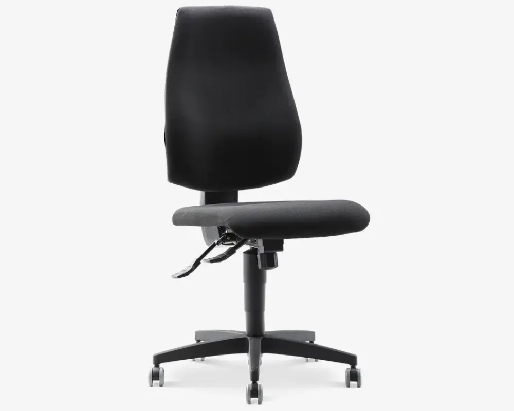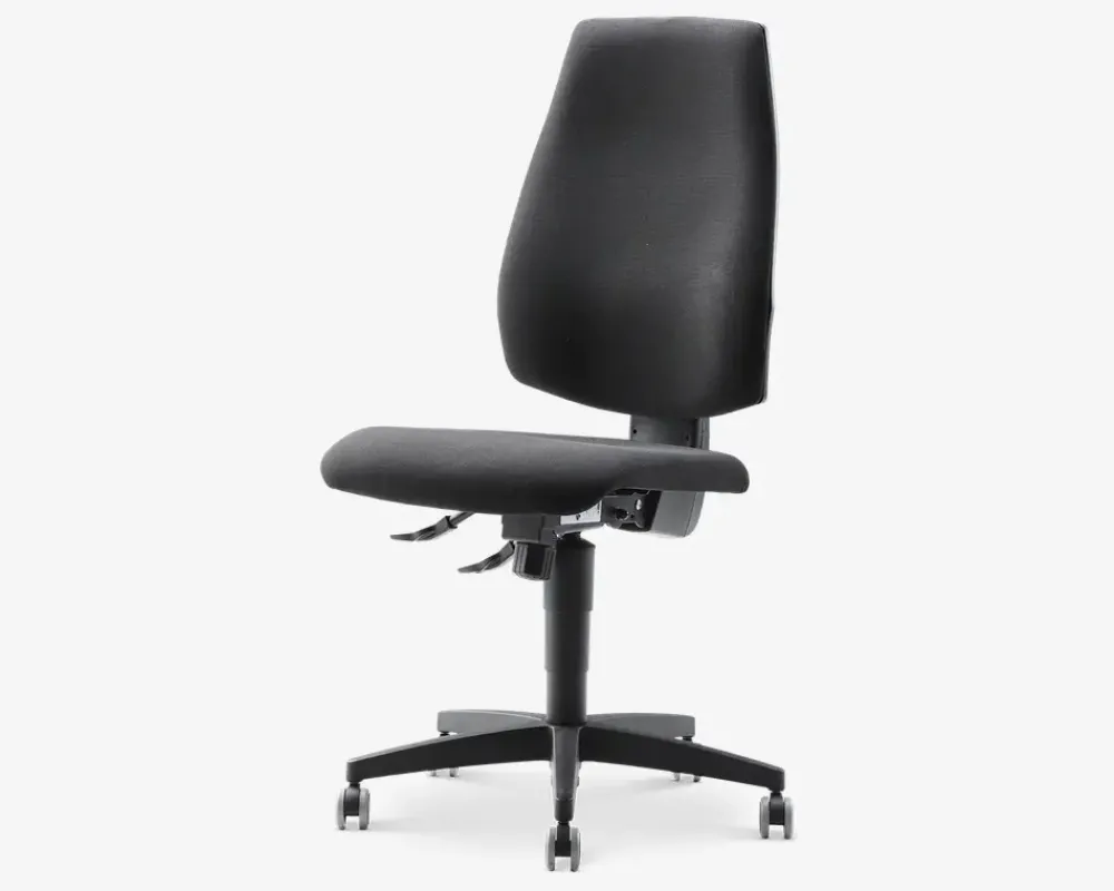 Den klassiske kontorstol med høj ryg er med en kraftig polstring med en behagelig og velkendt siddekomfort. ST 20 har forskellige indstillingsmuligheder som justering i højden med en trinløs gaslift, mulighed for at låse ryggen i ønsket position, tilt funktion som kan justeres efter vægt (gyngefunktion). Ryglæn med hældning og synkronmekanisme med spændingsjustering, trinløs lås bar. Med en synkron mekanisme, hvor man læner sig mod ryglænet, følger ryglænet og sædet kroppens bevægelse. Det sikrer en individuel tilpasning for optimal komfort. Med sit elegante design og de bløde, ergonomisk formede polstringer giver ST 20 både støtte og en god siddeoplevelse. Bemærk især det komfortable flade sæde med god støtte i knæleddet. Synkronmekanisme med spændingsjustering, trinløs lås bar. Synkron mekanisme giver mulighed for at læne sig bagud uden at løfte benene fra gulvet. Kan låses i faste positioner.Høj ryg og sæde med optimal ergonomisk støtte.En klassisk kontorstol i høj kvalitet, som holder længe.Mulighed for at tilkøbe justerbare og ergonomisk armlæn.Testet til brug i 8 timer dagligt og en vægt på 110 kg• Ergonomisk og funktionel• Formstabilt polyetherskum• Justerbar sædehøjde med gaspumpe• Gummihjul velegnet til hårde gulve• Synkron mekanisme• Vandafvisende polyester stof• Sædehøjde i cm. H.42-55• Mål i cm. B.48 x D.48 x H.104-115