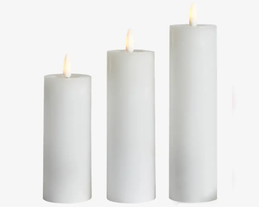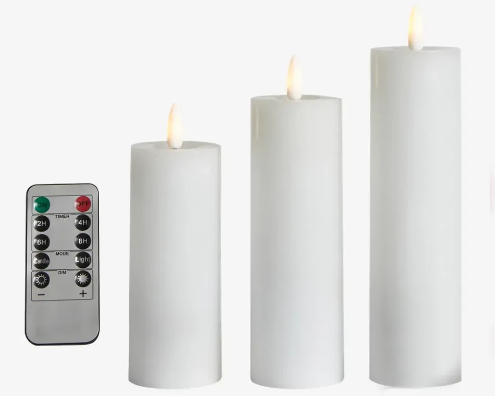 Dette LED-bloklys-sæt er det ideelle valg til at skabe en hyggelig stemning i dit hjem. Sættet indeholder tre LED-bloklys og en praktisk fjernbetjening, der giver dig fuld kontrol over belysningen. Hvert bloklys er designet til at efterligne ægte stearinlys og har en realistisk 3D-flamme, der skaber en varm og indbydende atmosfære. De blafrende flammer giver en beroligende effekt, og du kan nyde den hyggelige stemning uden bekymring for brandfare eller dryppende voks. Med den medfølgende fjernbetjening kan du nemt betjene bloklysene. Du kan tænde eller slukke dem, justere lysstyrken og endda vælge mellem forskellige lysfunktioner som blafrende eller kontinuerlig belysning. Det giver dig mulighed for at tilpasse belysningen efter dit behov og skabe den perfekte stemning.• Mål i cm: H.17,5/15/12,5 x Ø.5• Farve: Hvid• Lys: Varm hvid• Batteri: 3xAAA pr. lys, ekskl.• Inkl. fjernbetjening, (Batteri 1xCR2025, inkl.)