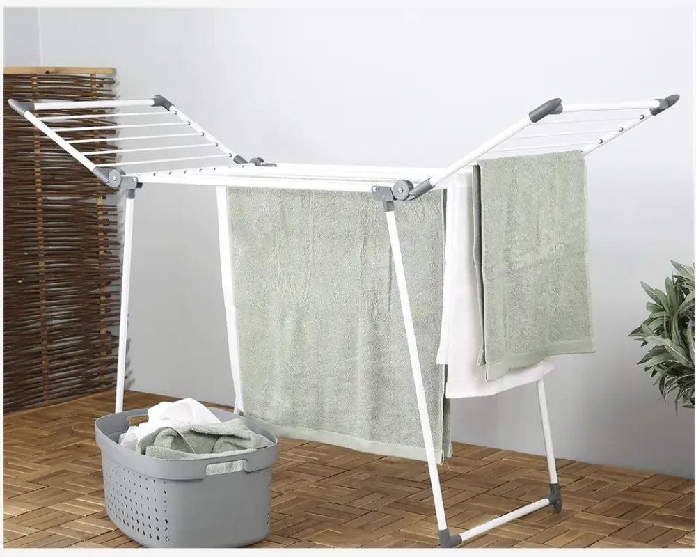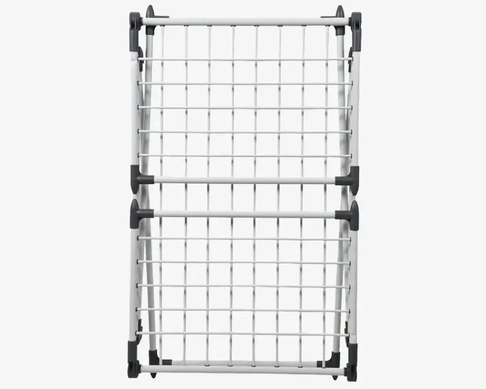 Praktisk sammenklappeligt tørrestativ med vinger og faste snore. Det kan både stå ude og inde og er nemt når det skal pakkes væk f.eks. kan det sættes ind i et skab el.lign.