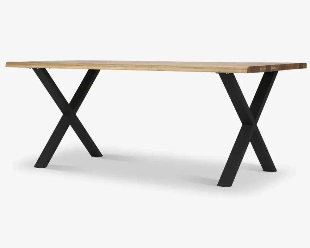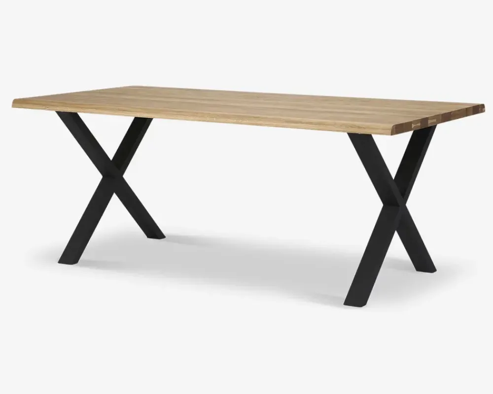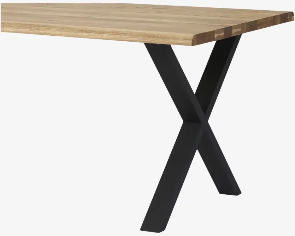 Flot plankebord i olieret eg, som med sin størrelse er perfekt til landkøkkenet eller den store spisestue. Spisebordet måler B. 95 x L. 195 cm, og giver således 6 gode spisepladser, hvis det er nok til hverdag.Spisebordet er fremstillet med en bordplade i 20 mm massiv eg, der er på limet en massiv kant på yderligere 20 mm, så du får looket af en tyk bordplade. Årsagen til at bordpladen er fremstillet på denne måde, er at dels for du et spisebord med et flot udseende, men samtidig sparer du på træet der benyttes til bordet, hvilket er godt for miljøet, og sidst men ikke mindst, får du et fedt spisebord til en meget attraktiv pris.Spisebordet skal vedligeholdes, det rengøres med en klud vredet op i rent vand, og 2 – 3 gange om året skal det mættes med neutralt træolie, for at bevarer en stærk og smudsafvisende overflade. Du skal følge vejledningen på det plejeprodukt du vælger at bruge, for at opnå det bedste resultat. Du bør behandle bordpladen første gang når du får den leveret, på den måde sikre du overfladen maksimal beskyttelse. Bemærk at bordpladen kan fremstå en smule mørkere umiddelbart efter du har givet den olie.• Stel i sort pulverlakeret stål• Mål i cm. : H. 75,5 x B. 95 x L. 190•Tillægspladesæt