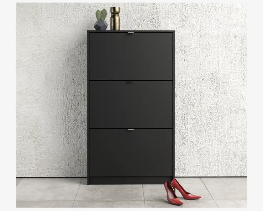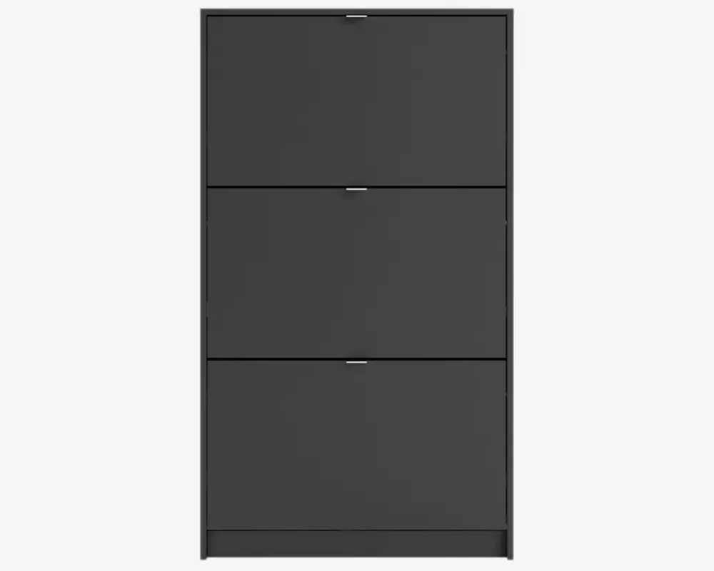 Et flot skoskab med 3 låger, som i alt giver plads til 18 par sko i varierende størrelser. Hver låge har 2 rækker, så hvis du mangler opbevaringsplads til dine sko, har du her muligheden. Skoskabet er en del af en serie bestående af skoskabe i forskellige størrelser, og de findes i flere forskellige farver, dette giver dig god mulighed for at finde en der passer hjem hos dig, uanset om det er størrelsen eller farven du ønsker at passe ind.Skoskabet er fremstillet i mat sort kunstfiner, som nemt rengøres, med en klud vredet op i rent vand. Der skal ikke bruges rengøringsmidler, er du uheldig og få et sål mærke på skabet, kan denne fjernes med en lille smule husholdningssprit på en klud. Sten og jord vil ridse skuffen indvendigt. Vi anbefaler grundet den lille dybde på skabet at det fastgøres til væggen, på den måde sikre du at skabet ikke vælter når du åbner den øverste låge. Skabet leveres usamlet, hvis du følger den vedlagte samlevejledning samles det nemt, men det tager lidt tid.• Findes i 3 farver• Findes i 3 højder• Mål i cm.: H.123,6 x B.70,3 x D.24,05• Leveres usamlet