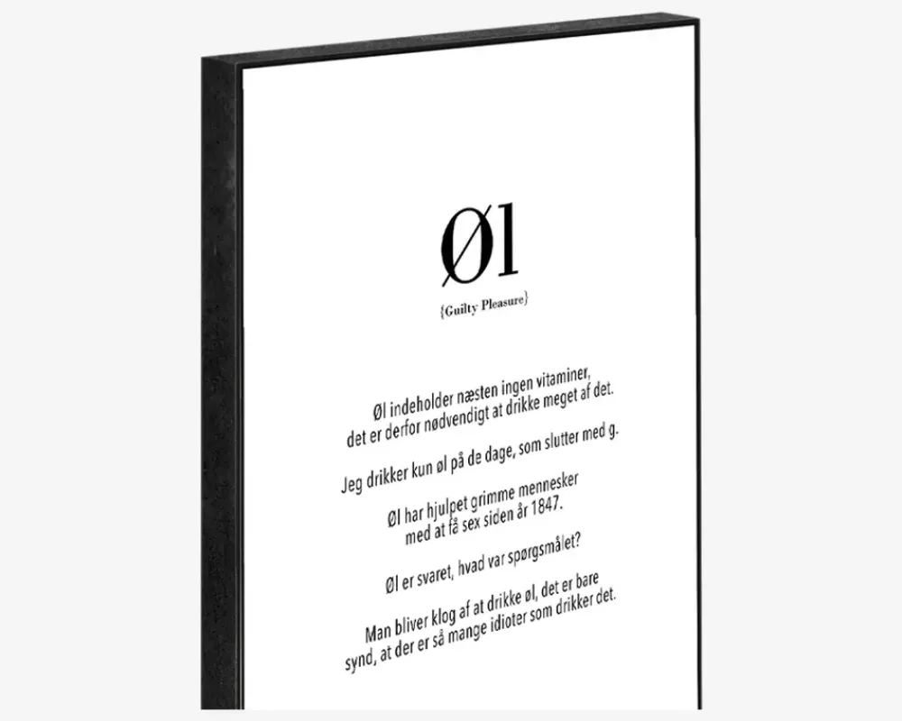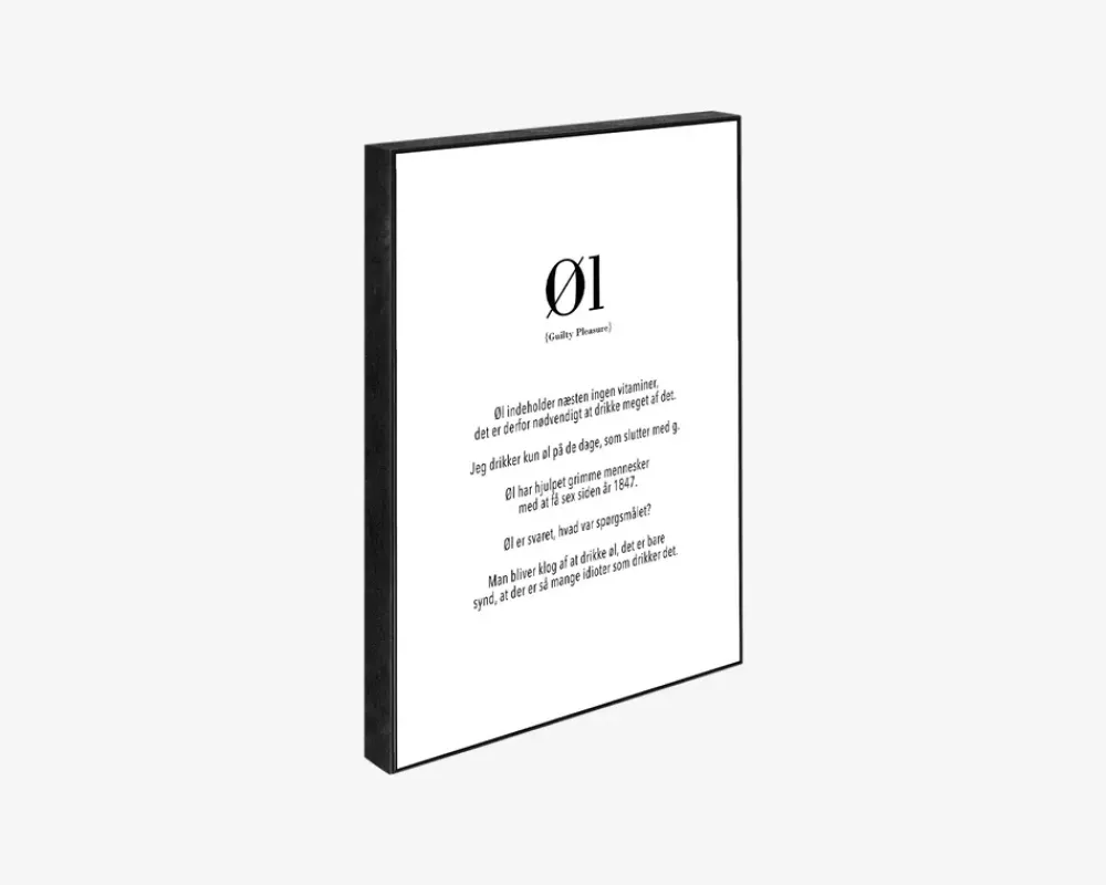 Galleriklods med citater om Øl.Fin galleriklods til ophæng eller som stående dekoration. Galleriklodsen er lavet af en 1,6cm tyk MDF-blok med et mat lakeret kort. Til montering og ophæng på væg har galleriklodsen et 1,4cm hul, til enten en skrue eller et søm.