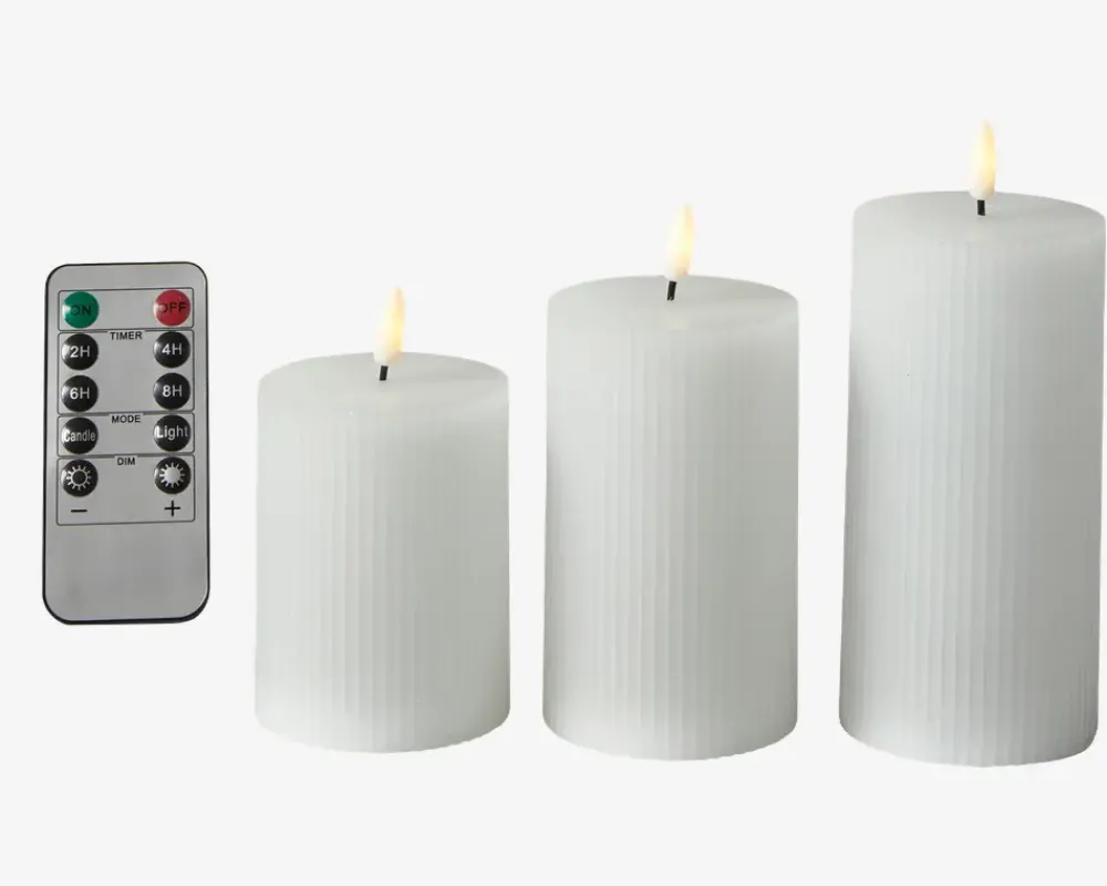 Dette LED-bloklys-sæt med riller er det ideelle valg til at skabe en hyggelig stemning i dit hjem. Sættet indeholder tre LED-bloklys og en praktisk fjernbetjening, der giver dig fuld kontrol over belysningen. Hvert bloklys er designet til at efterligne ægte stearinlys og har en realistisk 3D-flamme, der skaber en varm og indbydende atmosfære. De blafrende flammer giver en beroligende effekt, og du kan nyde den hyggelige stemning uden bekymring for brandfare eller dryppende voks. Med den medfølgende fjernbetjening kan du nemt betjene bloklysene. Du kan tænde eller slukke dem, justere lysstyrken og endda vælge mellem forskellige lysfunktioner som blafrende eller kontinuerlig belysning. Det giver dig mulighed for at tilpasse belysningen efter dit behov og skabe den perfekte stemning.• Mål i cm: H.15,3/12,5/10 x Ø.7,5• Farve: Hvid• Lys: Varm hvid• Batteri: 3xAAA pr. lys, ekskl.• Inkl. fjernbetjening, (Batteri 1xCR2025, inkl.)
