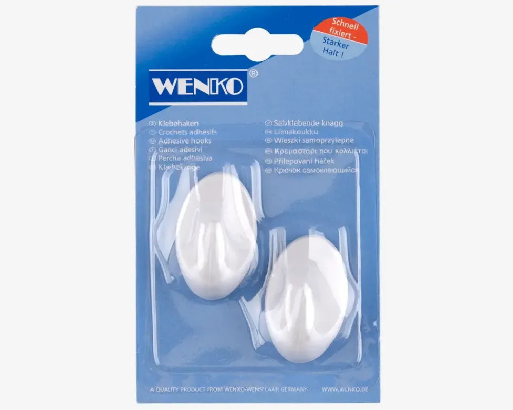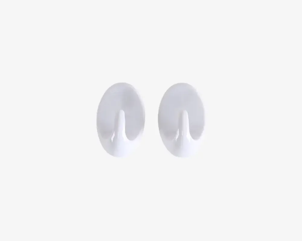 Hvide knager i plast, med selvklæbende bagside, hvilket sikre at væggen er uden mærker, hvis knagerækken evt. skulle tages ned igen. Det enkle design og den neutrale farve gør at knagerækken passer til ethvert badeværelse.