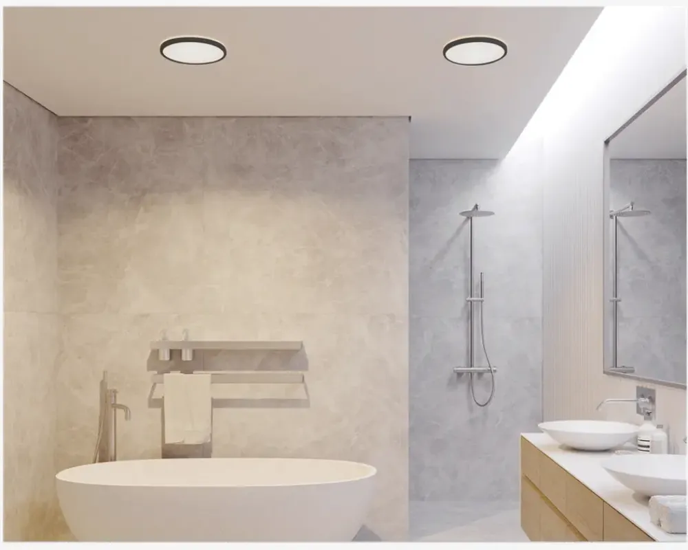 Diskret plafond i et klassisk og tidsløst design, som er ideel til rum som f.eks. entré, bryggers eller vaskerum. Lampen kommer med et indbygget 3-step dæmpning, som gør det nemt at justere lysstyrken. Lampen kommer med IP54, hvilket gør den ideel til vådrum. • Mål i cm: H.2,3 x Ø.29,4• Farve: Sort• Materiale: Plast• Lumen: 1600• Kelvin: 3000/4000• Levetid i timer: 30.000• Integreret LED 14,5 watt• IP54