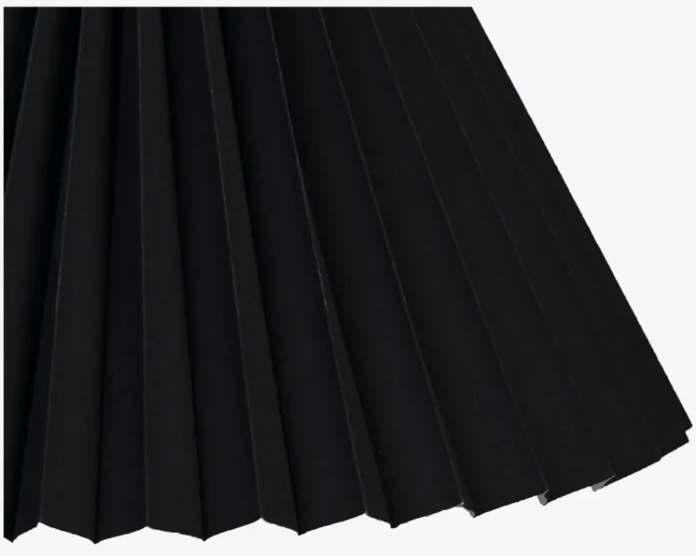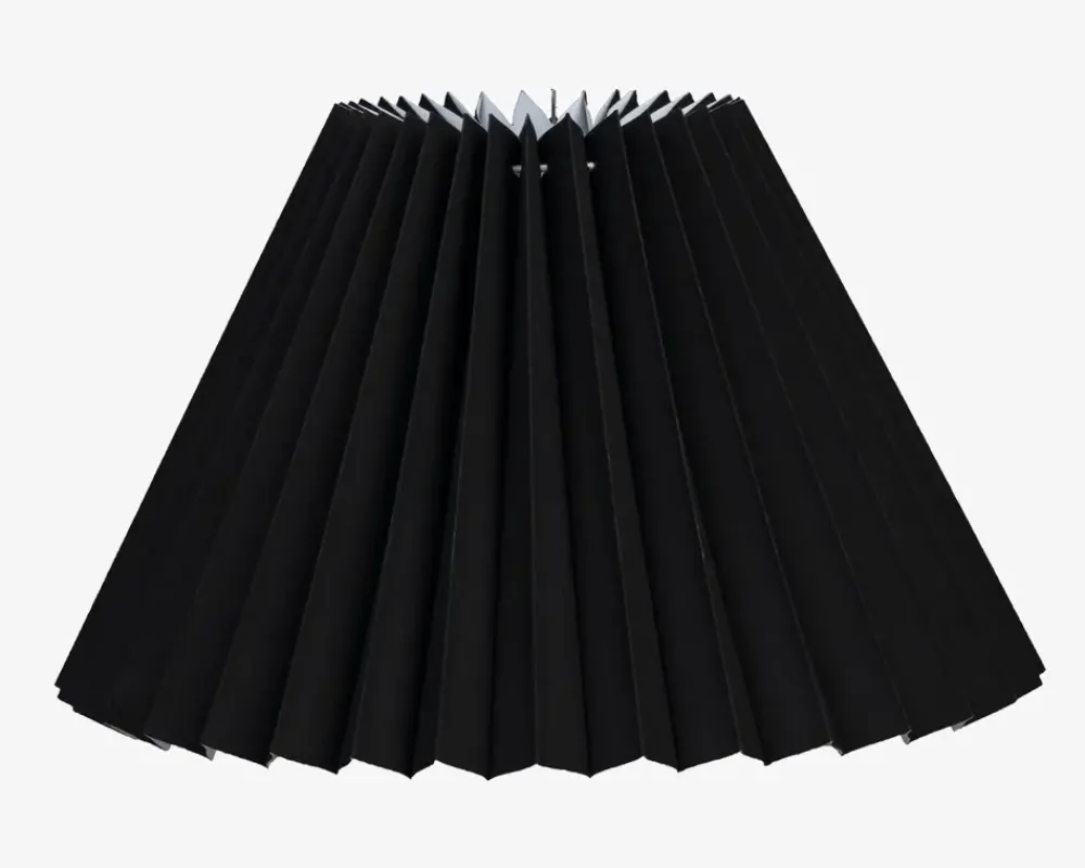 Flot og klassisk lampeskærm af stof/plastik , som passer ind i ethvert hjem, da den sorte farve er neutral. Lampeskærmen er særligt velegnet til en lampefod som kan købes fra sortiment. Lampeskærmen sættes på ved at to metalbøjler inde i lampeskærmen klikkes ned over pæren.