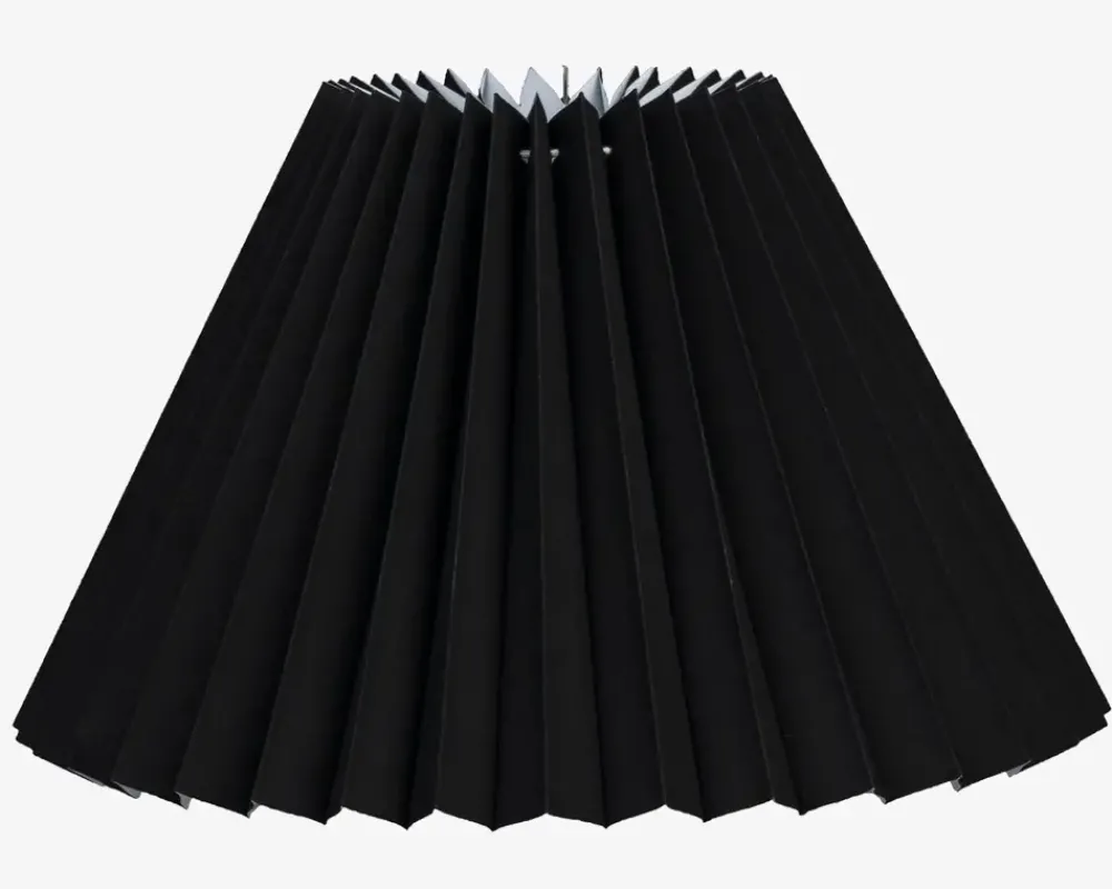 Flot og klassisk lampeskærm af stof/plastik , som passer ind i ethvert hjem, da den sorte farve er neutral. Lampeskærmen er særligt velegnet til en lampefod som kan købes fra sortiment. Lampeskærmen sættes på ved at to metalbøjler inde i lampeskærmen klikkes ned over pæren.
