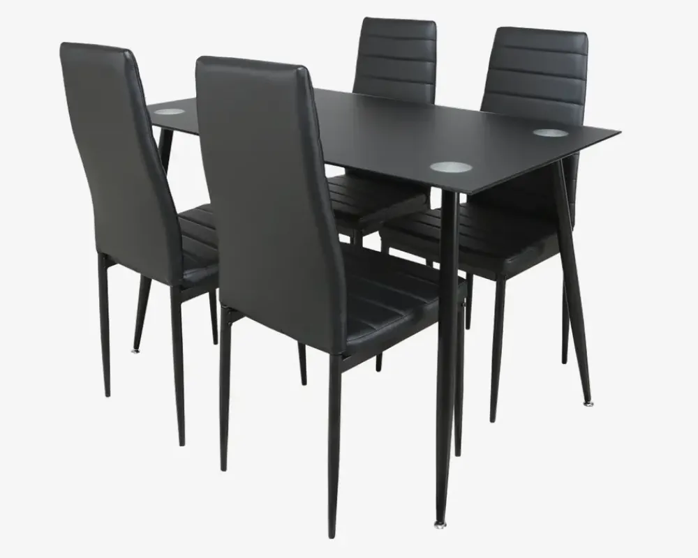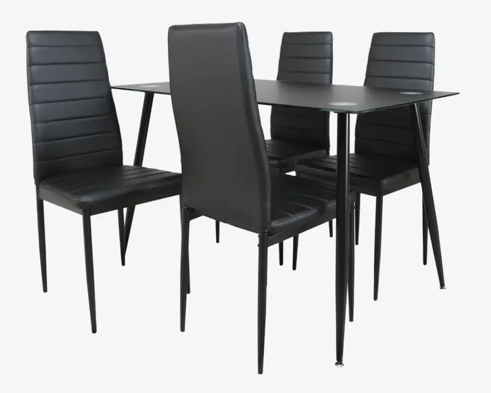 Her er det perfekte spisebordssæt til ungdomsboligen, køkkenet eller den lille lejlighed. Spisebordet giver 4 gode spisepladser, og har også en højde, som gør det brugbart i forhold til at lave lektier, både alene og i gruppe. Bordet er fremstillet med 4 ben i pulverlakeret sort stål, og en bordplade i 8 mm hærdet glas, som har film på klæbet på bagsiden, så man kan sidde ugeneret, også i en kort kjole. De 4 spisestuestole er beklædt med en sort kunstlæder, som er nem at rengøre. Stolen er bedst egnet til korte måltider, hvis du ønsker at bruge bordet til at lave lektier, bør du have en kontorstol, som er skabt til at sidde i, i længere tid. De 4 spisestuestole fylder ikke meget, men giver en rimelig siddekomfort på grund af den høje ryg.Spisebords sættet rengøres med en klud vredet op i rent vand, hvis bordpladen trænger kan du bruge spejl eller glasrens, men ellers kræver møblerne ikke nogen vedligeholdelse. Bordpladen tåler meget varme, men vi anbefaler alligevel at du bruger varmebrikker, mest for at undgå ridser, derfor anbefaler vi også brug af dækservietter, når du dækker op.