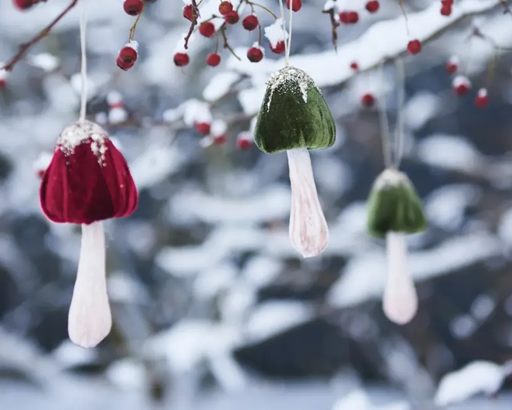 Sød svamp fra Speedtsberg i rød eller grøn med glimmer, til ophæng på juletræet eller i vinduet.