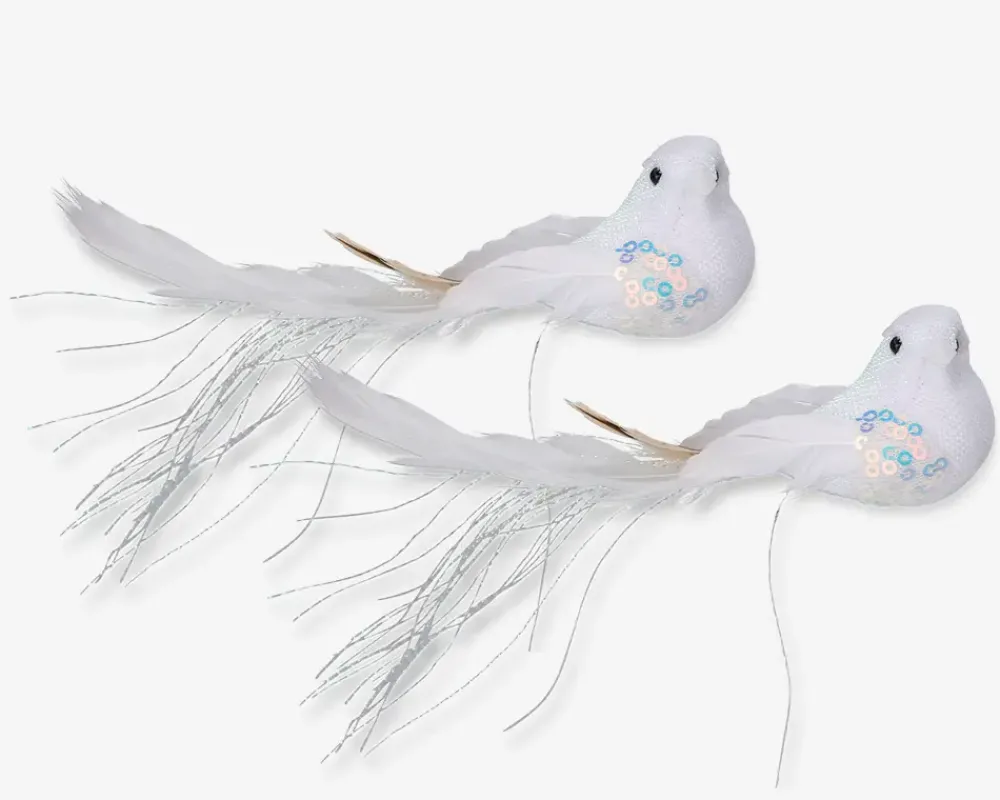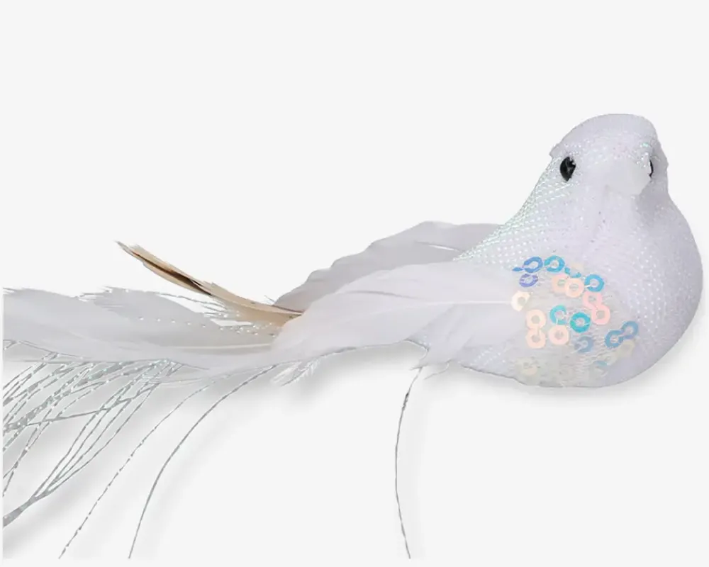 Smuk fredsfugl med guld glimmer i hvid. Fuglen har klips på undersiden, så den nemt kan sættes fast på juletræet.