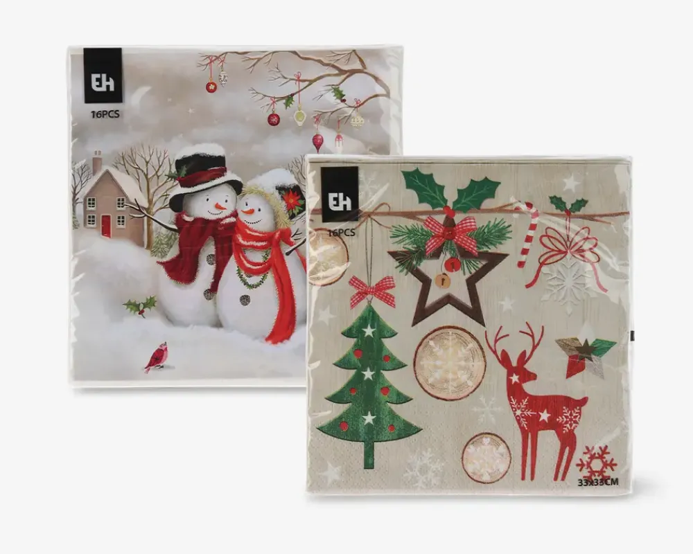 Servietter med julemotiver der kan pynte på et flot dækket bord. Bemærk at de kommer assorteret, købes enkeltvis og at der ikke kan vælges farve ved køb i webshoppen.