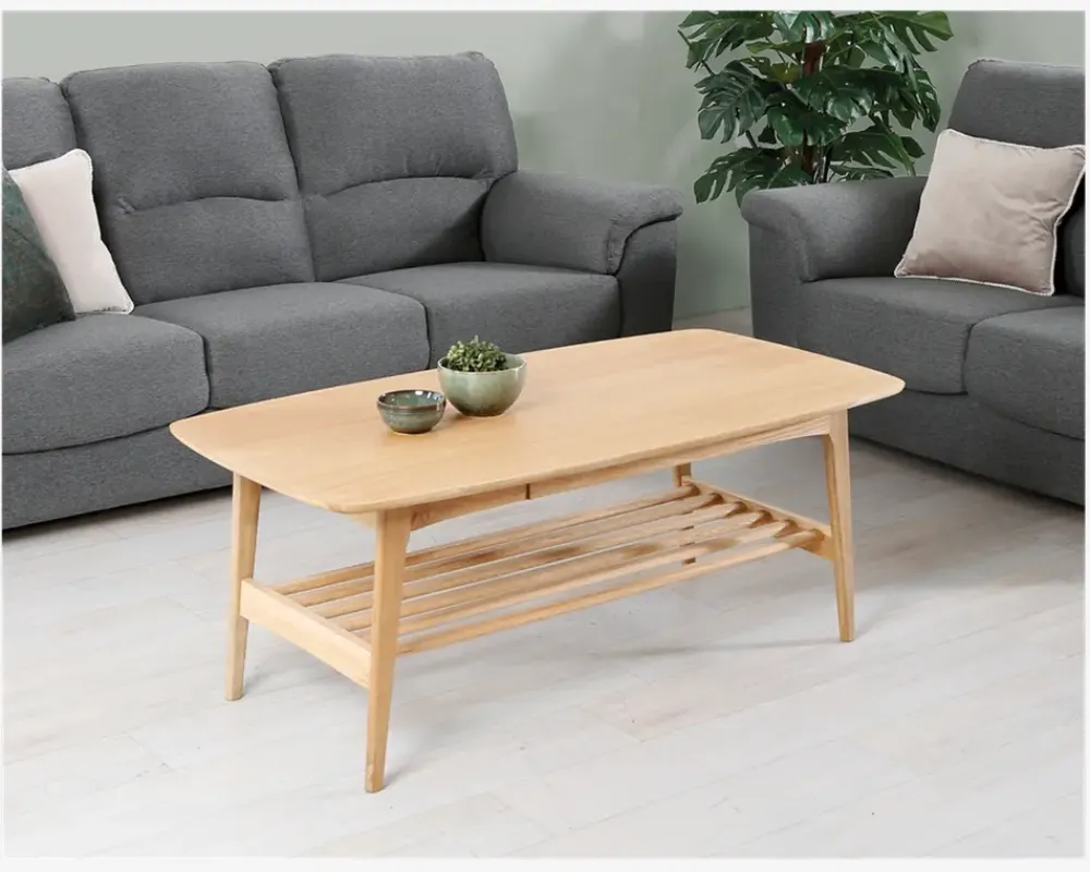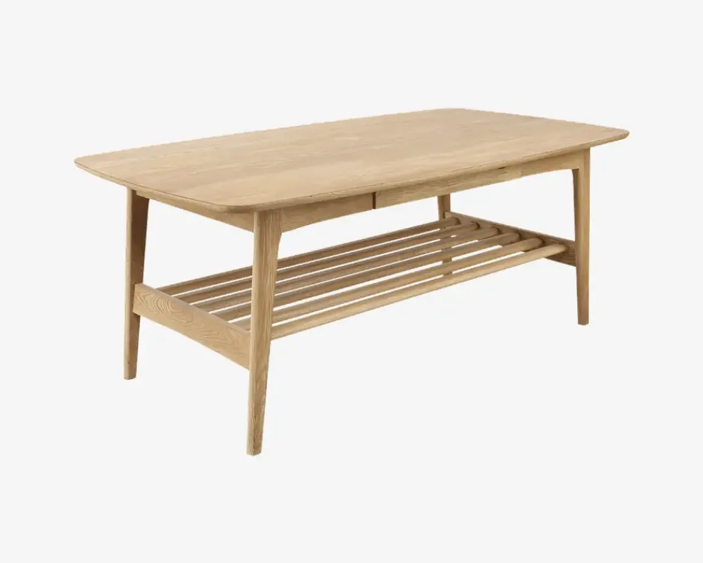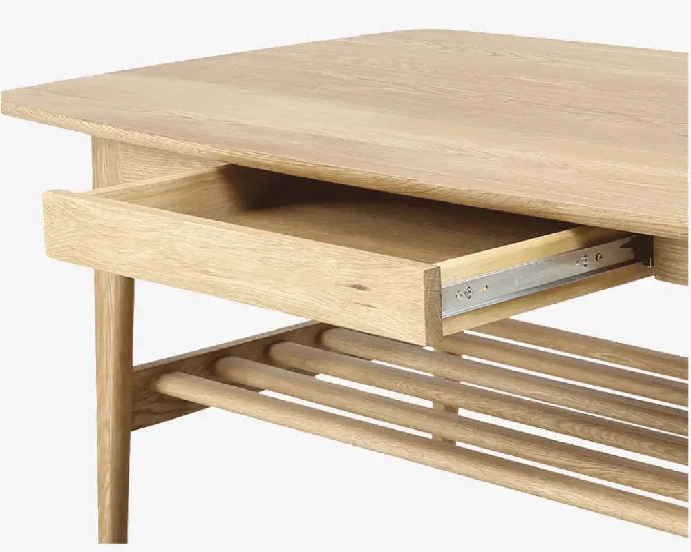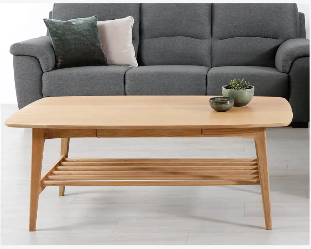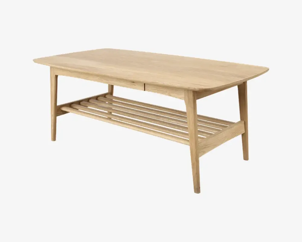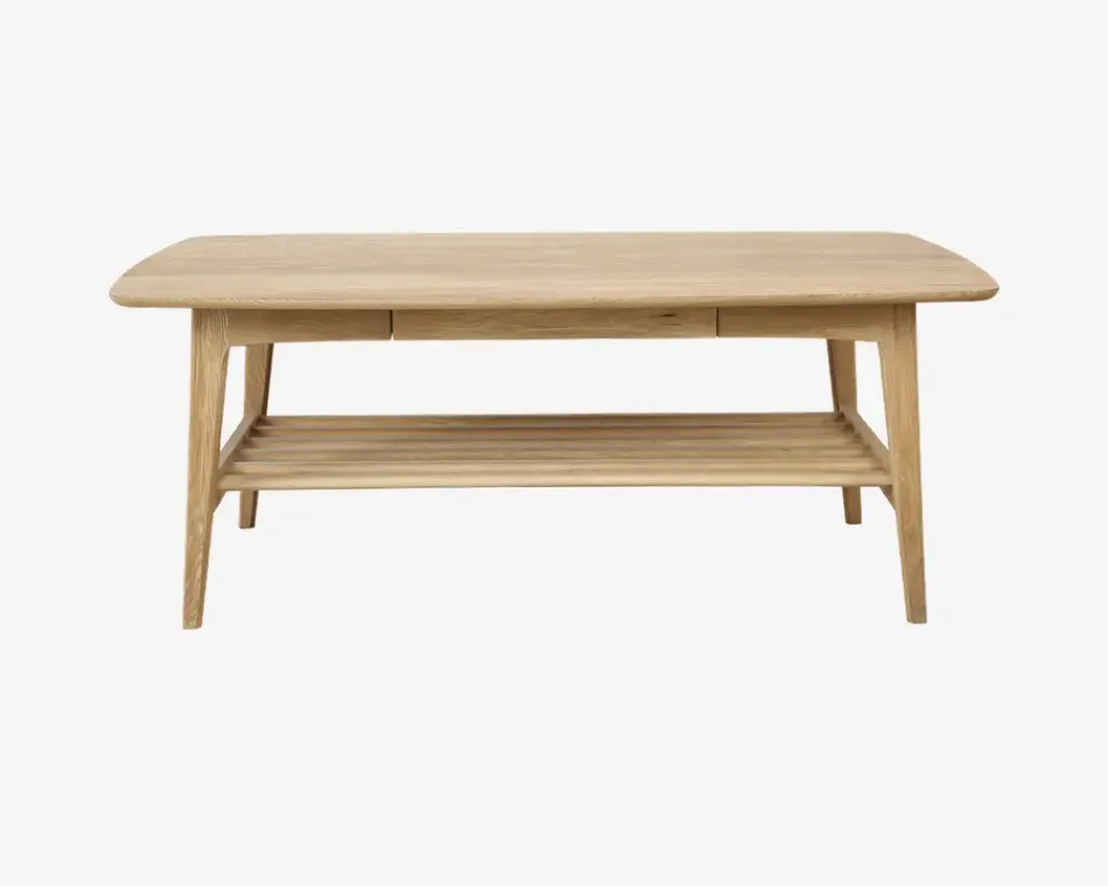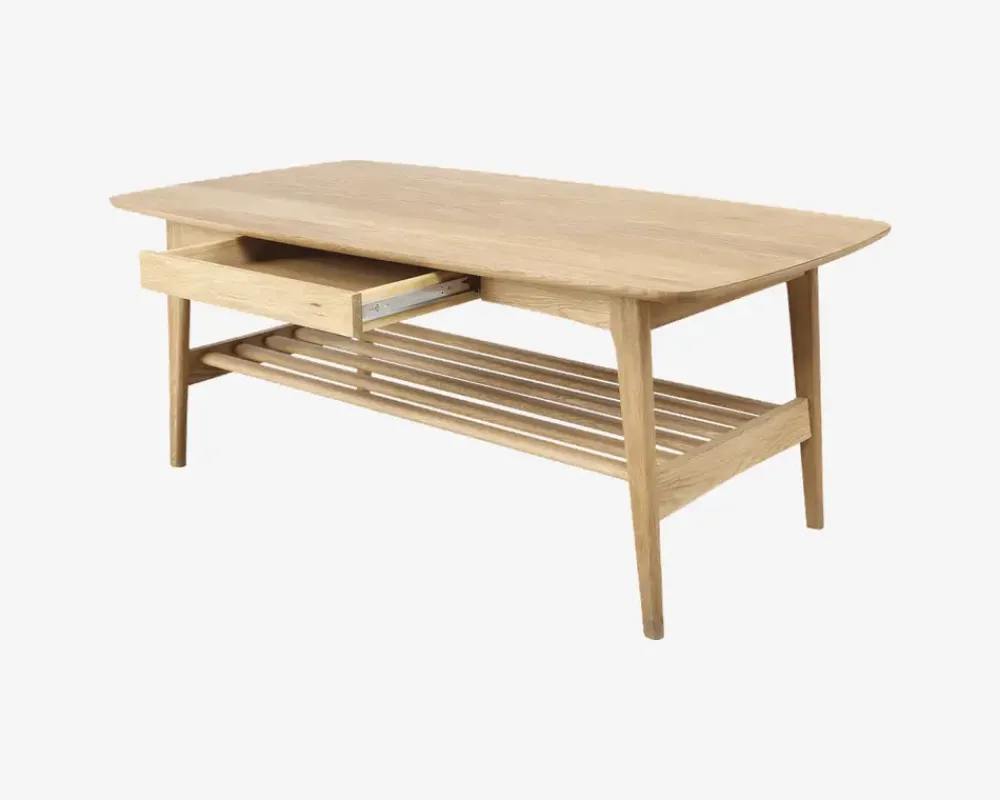 Lækkert og flot designet sofabord i den moderne retrostil. Sofabordet har en aflægningshylde under bordpladen til opbevaring af magasiner, blade, aviser og meget andet. Det gør at man altid kan have en flot ryddet bordplade. Bordet har ydermere en skuffe i sargkanten til opbevaring af de ting man ikke vil have liggende fremme. Bordet er fremstillet med en bordplade i fineret oliebehandlet eg og med et delmassivt stel. Dette gør at bordet er meget holdbart og stabilt. Bordet leveres usamlet men samles nemt.• Enkel og moderne sofabord• Flot retrostil• Med aflægningshylde og skuffe• Fineret, oliebehandlet eg• Delmassivt stel• Leveres usamlet, men samles nemt• Mål i cm: B.70 x L.130 x H.51